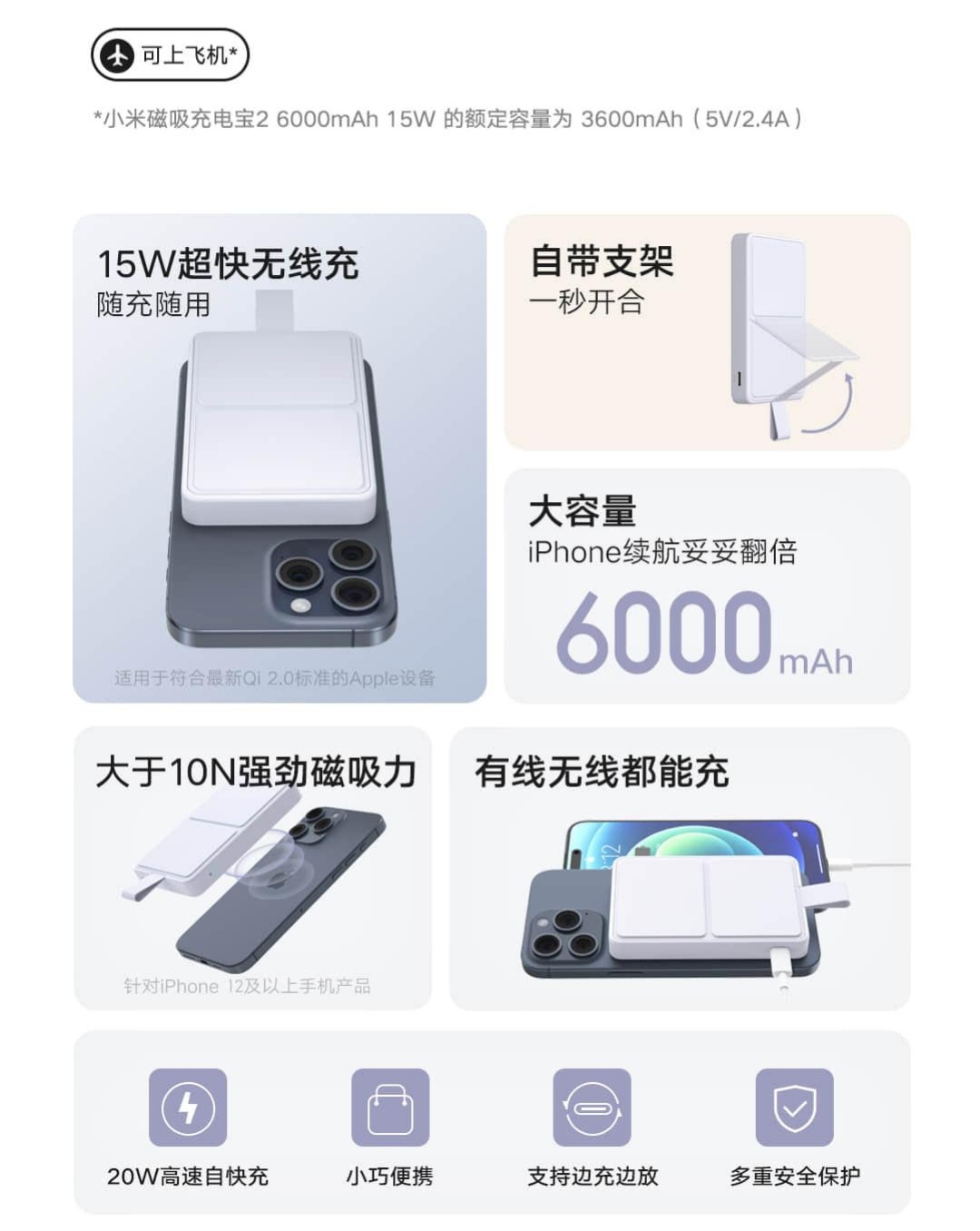 據悉,小米磁吸充電寶2的容量爲6000mAh,支持最高15W的無線充電功率。這一容量可以滿足大部分用戶一天的充電需求,而15W的充電功率則意味着它可以快速地爲手機充電。此外,這款充電寶還支持有線充電,可以邊充邊放,極大地方便了用戶的使用。