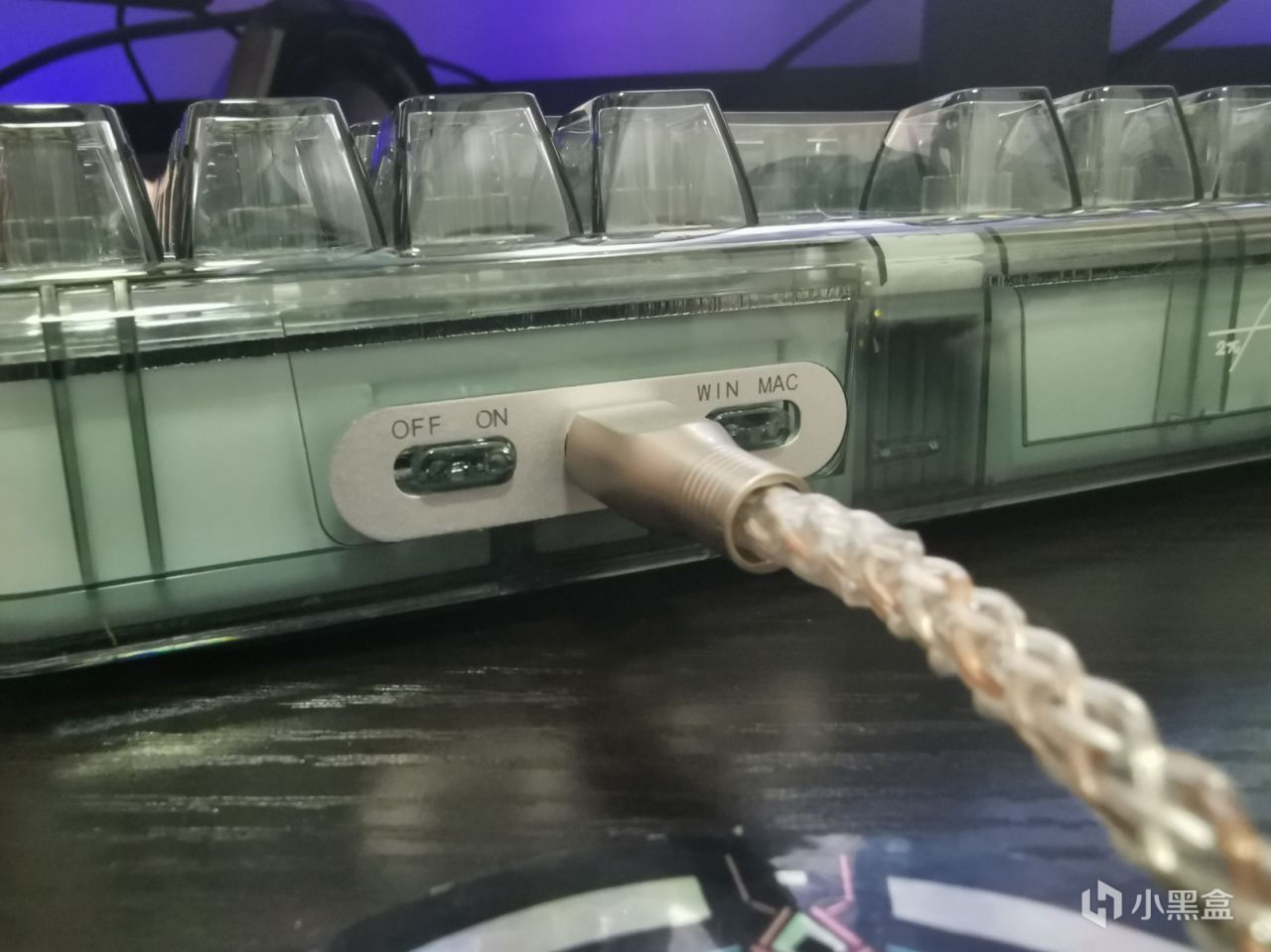 win/mac系统切换、电源开关以及Type-c接线口放在了背面。从侧面看,透过透明外壳可以看见键盘内的硅胶填充。键盘内部采用的是GASKET+硅胶垫全封闭,支持全键热插拔。