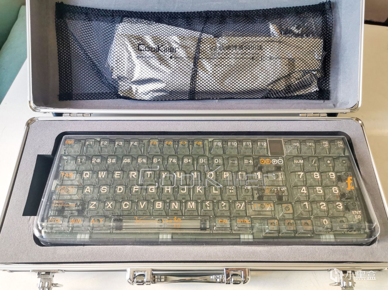 军火箱是铝框的材质,打开军火箱后,键盘和键盘配件分装在箱体的两侧。