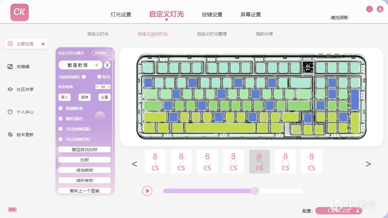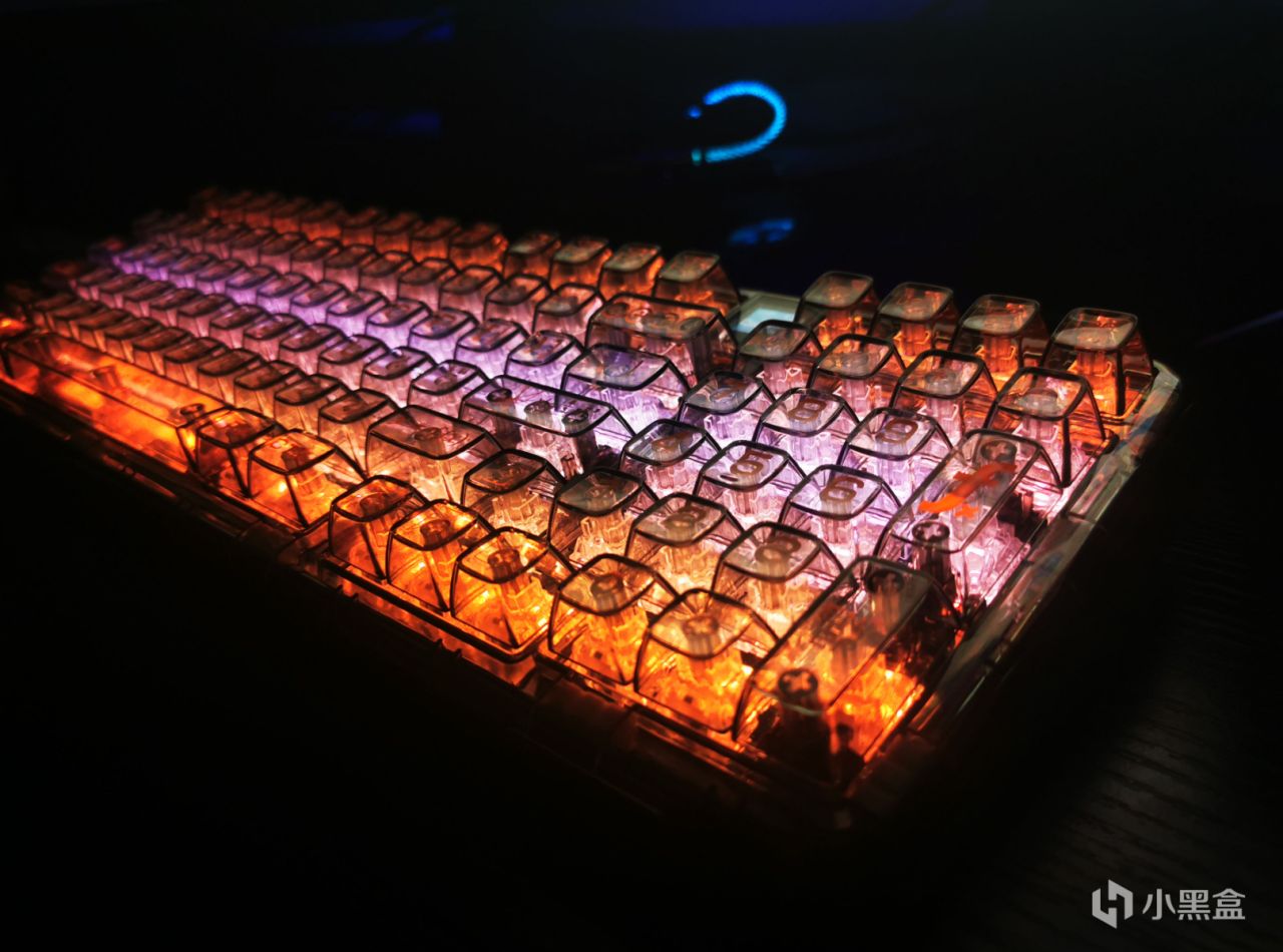 刚好说到驱动,就顺便提提灯光效果,全透键帽不来点光污染都对不起这透明度,除了每颗轴下的灯珠之外,空格键拥有一整条灯带。除了出场时已经调配好的十几种灯效之外,在ck自研驱动上也可以设计自己的喜欢的灯光颜色与效果,并且驱动上对灯光颜色的调整更丰富!