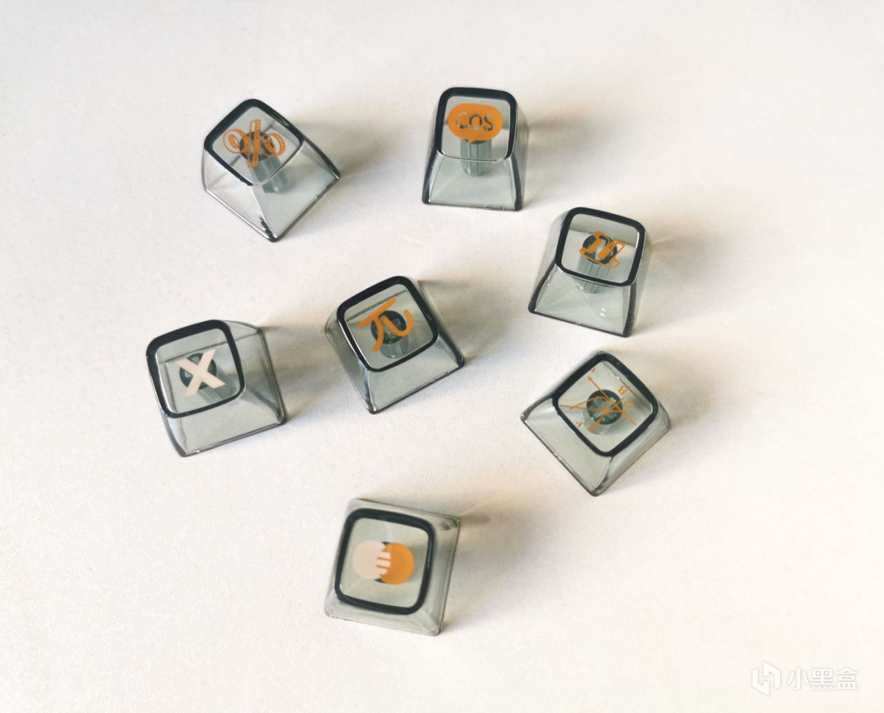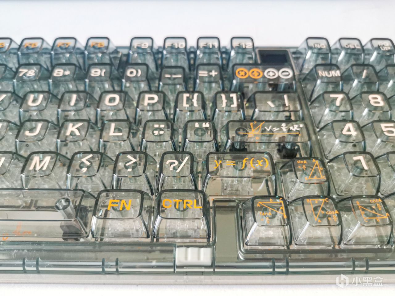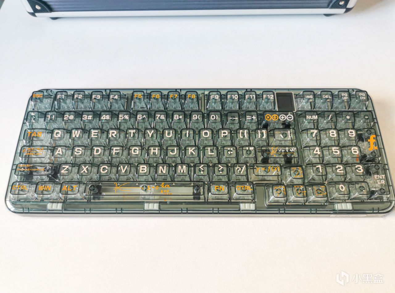 键帽采用了定制的高透感PC材质,白色橙色双色字符,键帽上的部分印花配合数字家主题,搭配上了趣味函数字符。数学公式作为数学考试的基础已经深刻的印在了脑子里,上班了虽然用不到这些东西,但却有一种亲切的熟悉感。
