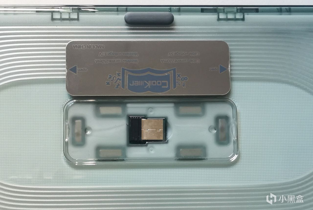 底部外壳的中间隐藏了接收器的位置,在内部放置了磁吸,外部则用一片薄薄的金属铁片覆盖,既能当作LOGO 又能用来隐藏插槽,非常不错的想法。