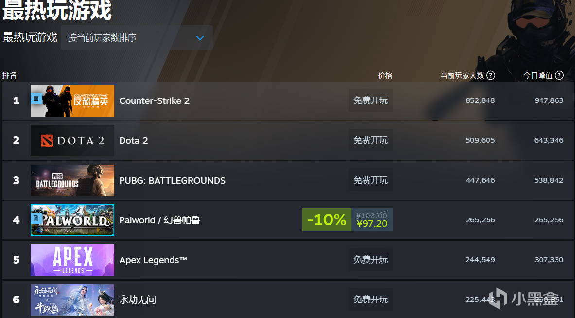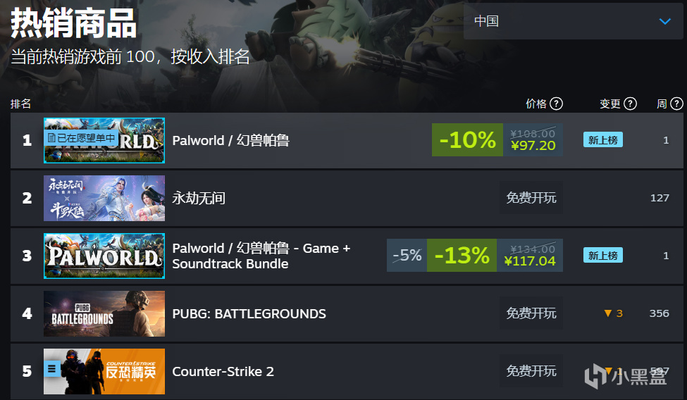目前《幻獸帕魯》是兩個熱銷榜中排名前五里面的唯一一款付費遊戲,並且在線人數排行榜中排第四,前五分別是: