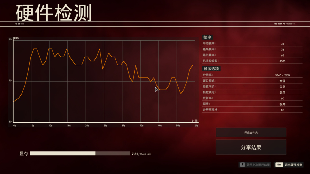默認最高,FSR設置爲“質量”,2K 68幀,4K 43幀,2K下還是毫無壓力的,幀率基本能維持在60以上。