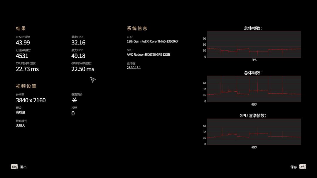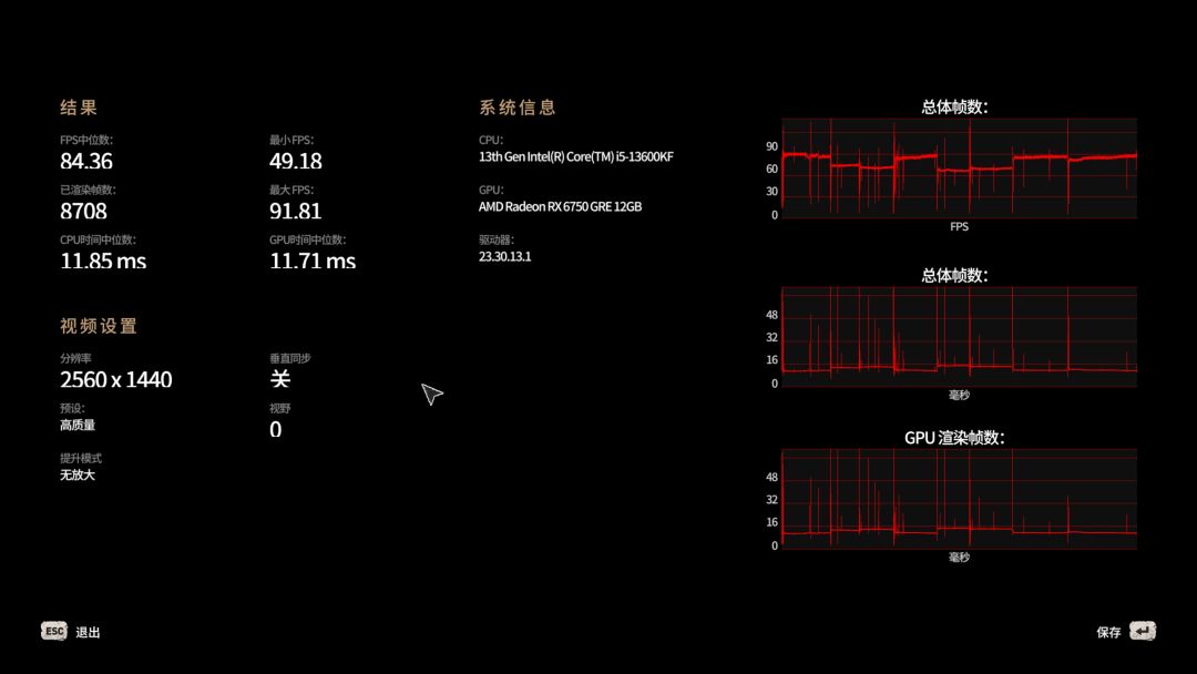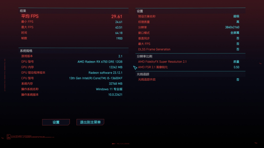 默認最高,光追關閉,FSR設置爲“質量”,2K 66幀,4K 30幀。賽博朋克果然是硬件殺手,不過6750GRE同樣可以滿足2K分辨率的需求: