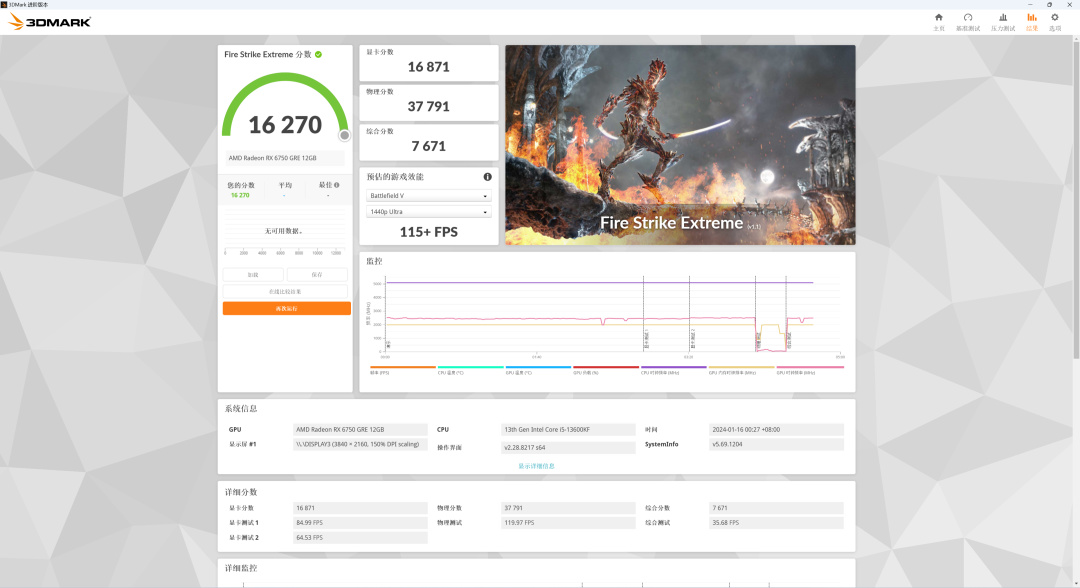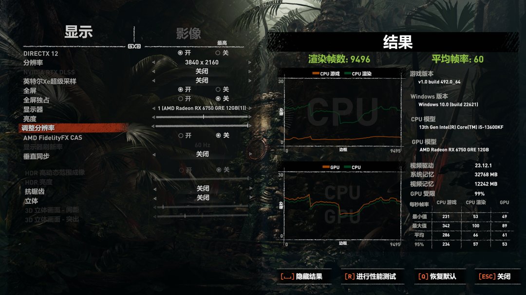 Portal Royal:6282分,這個成績也比RTX4060更高,說明6750GRE也有較強的光追性能。
