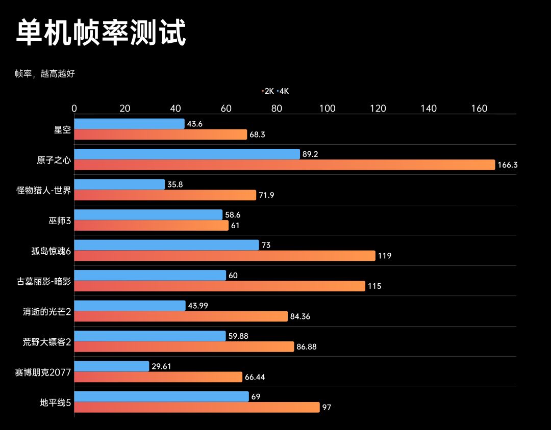 其中,星空、原子之心、怪物獵人-世界和巫師3由於遊戲沒有自帶跑分,選擇同一個存檔,在同一個地圖、關卡下進行遊戲,並用afterburner記錄幀率,其餘遊戲均以內置Benchmark爲準。