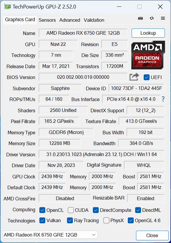 先來看看GPU-Z識別,RX6750GRE採用RDNA 2架構,Navi 22核心,擁有2560個流處理器,12GB GDDR6顯存,顯存位寬192bit,規格和RX6750XT基本一致,只是頻率相比後者有所降低,藍寶石黑鑽作爲三風扇非公顯卡,在頻率上相比公版有所提升,Boost後的頻率達2581MHz,略低於極光版。