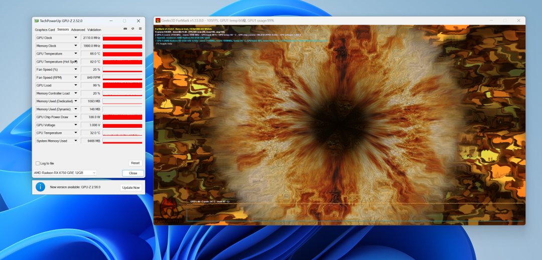 爲了驗證藍寶石RX6750GRE黑鑽的散熱性能,室溫25℃,單烤顯卡。