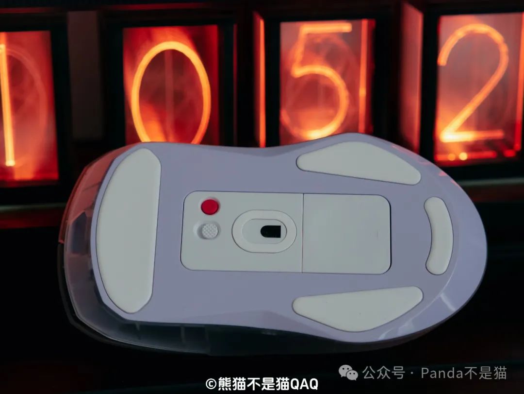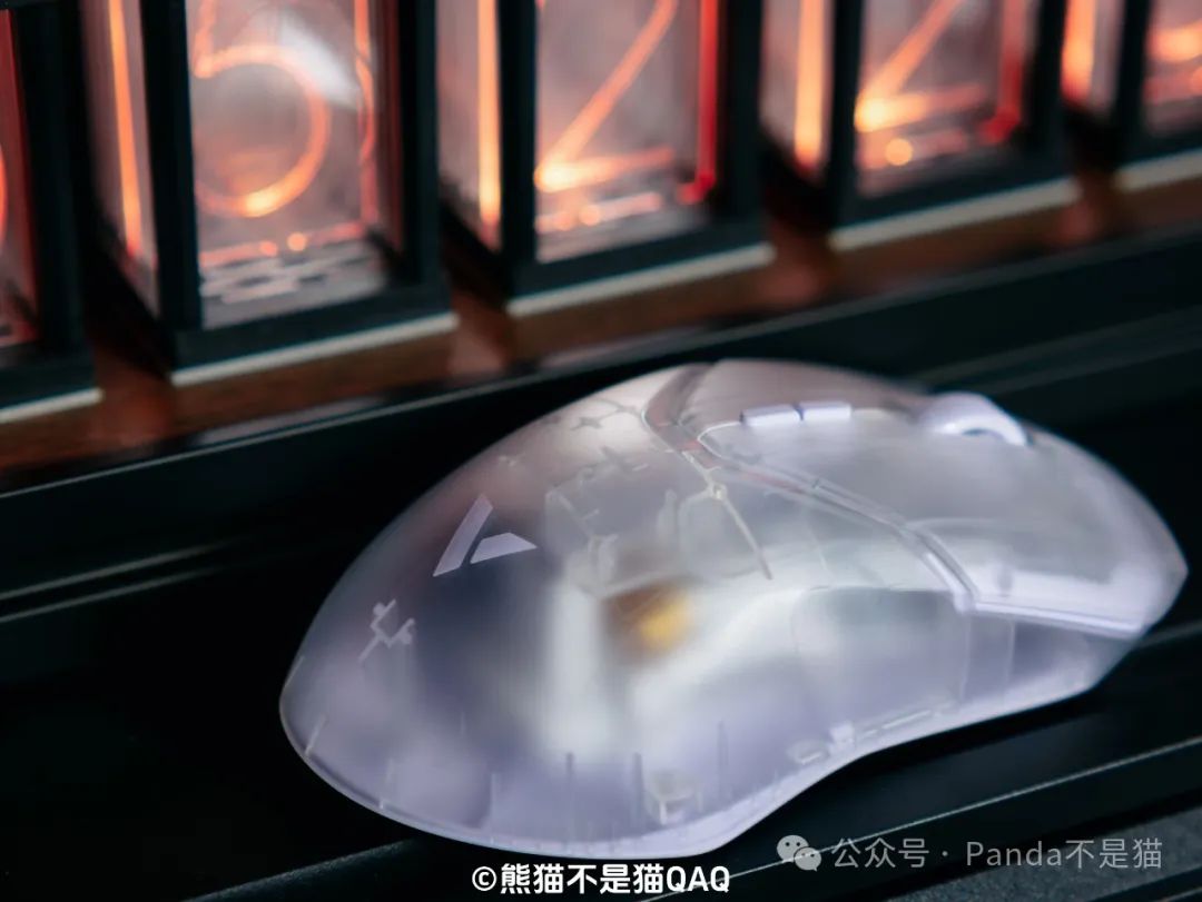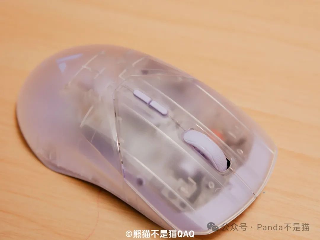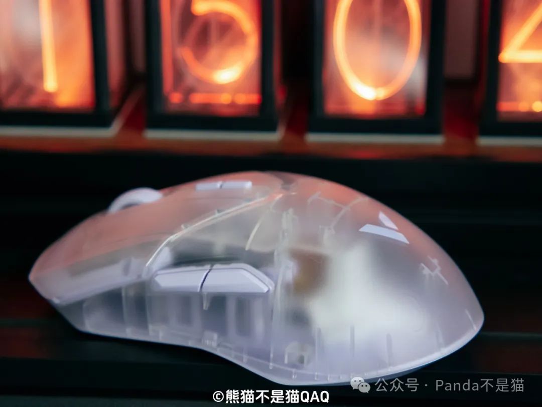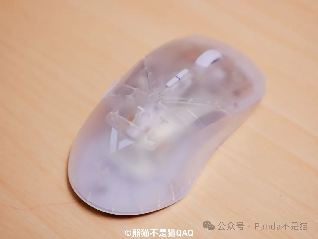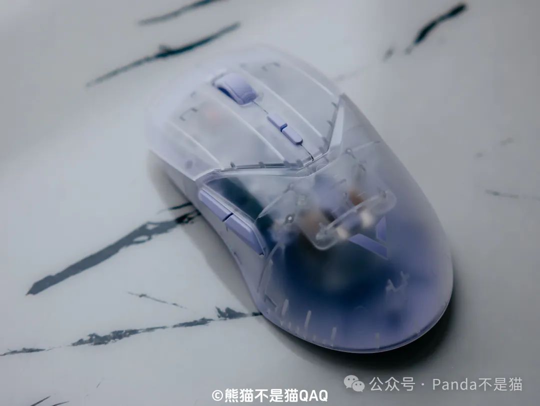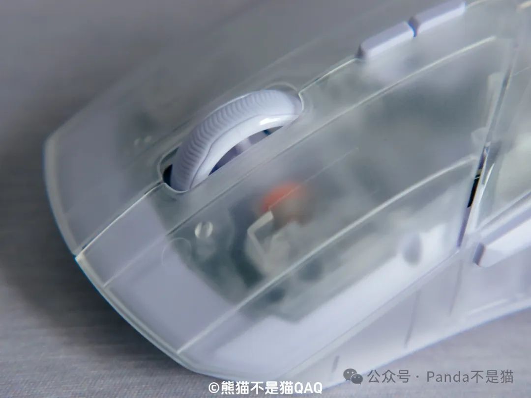 第一印象我給出了9分的高分,再看細節方面。外殼採用了半透的磨砂細紋外殼,這種外殼設計對於我這種汗手油手真的是福音,長時間使用不用擔心打油的情況。同時磨砂的工藝也讓鼠標能夠更爲跟手,不打滑,細節方面考慮很到位。