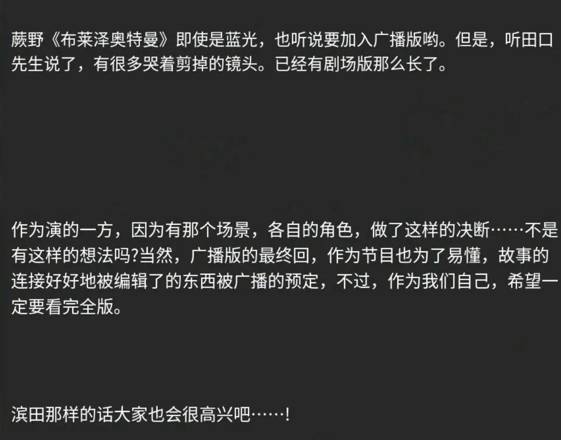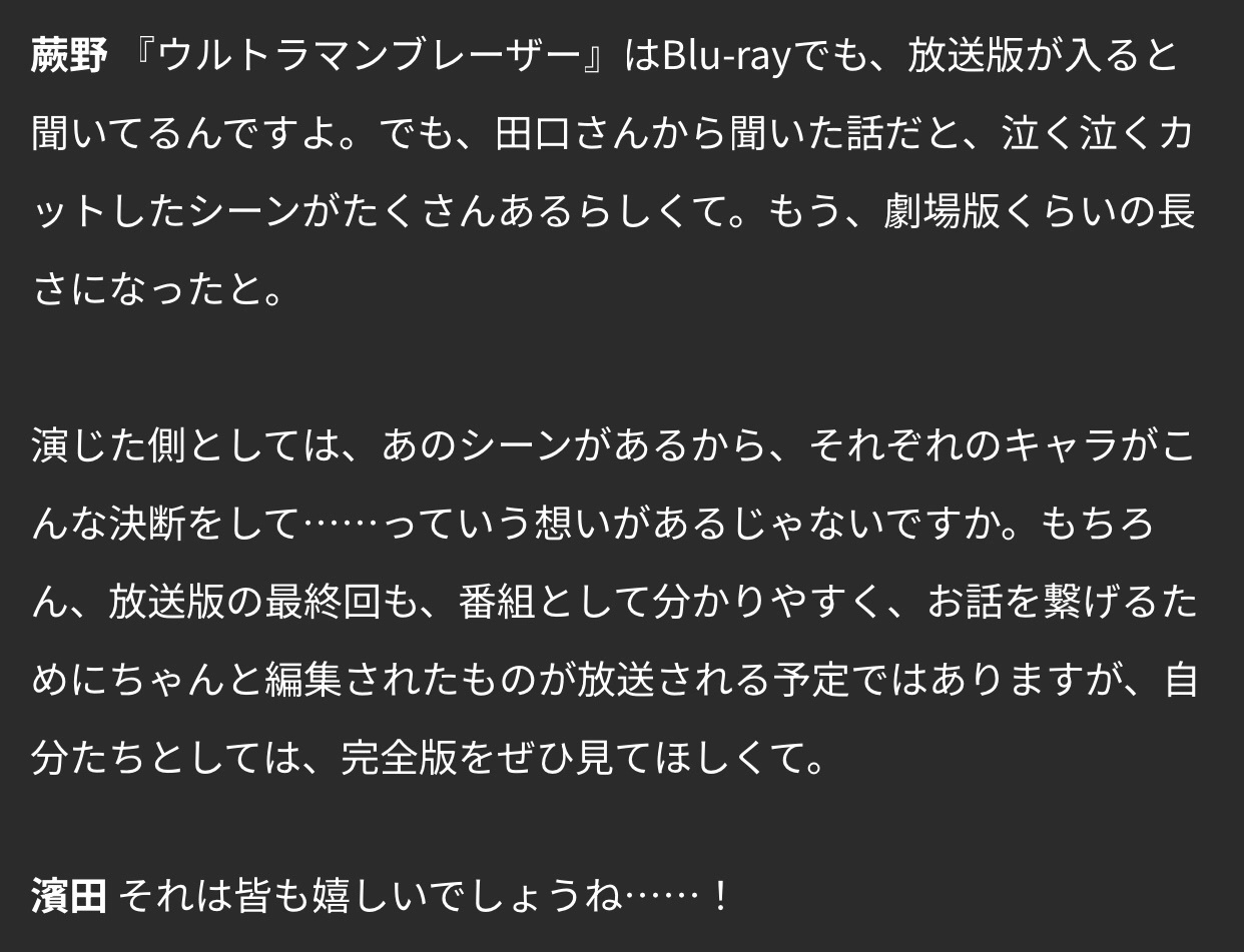 男主角比留間弦人的演員蕨野友也透露,布萊澤結局因爲時長原因,刪減後的時長加起來,足足有一部劇場版時長
