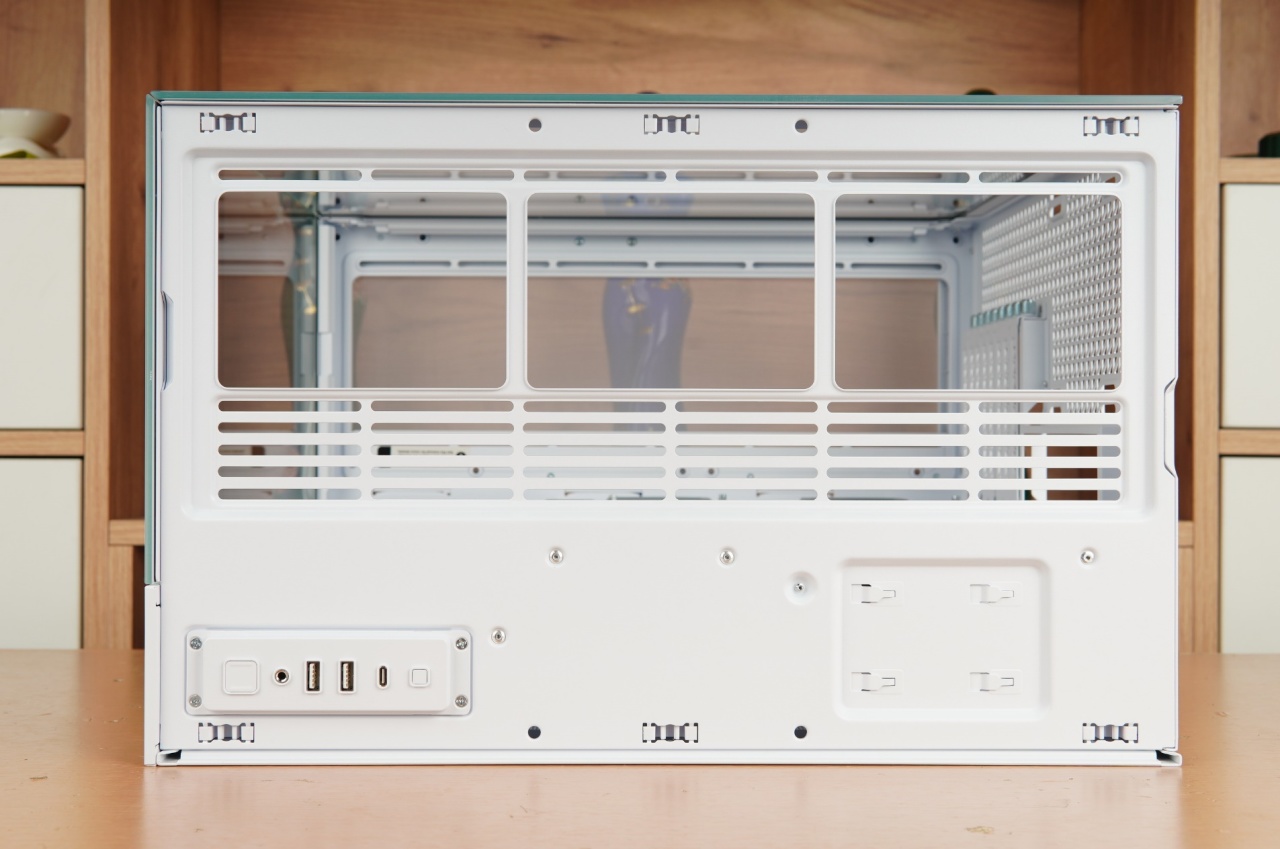 机箱的I/O面板设计在了机箱顶部,出厂标配有防尘塞,配置方面为2个USB3.0接口、1个Type-C接口以及1个二合一音频接口,重启键也同样得到了保留。