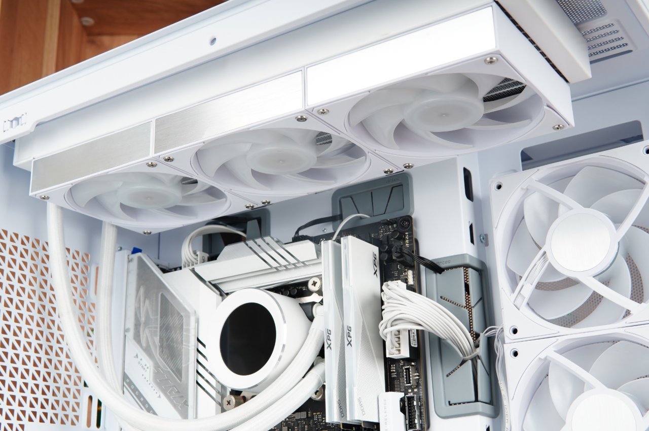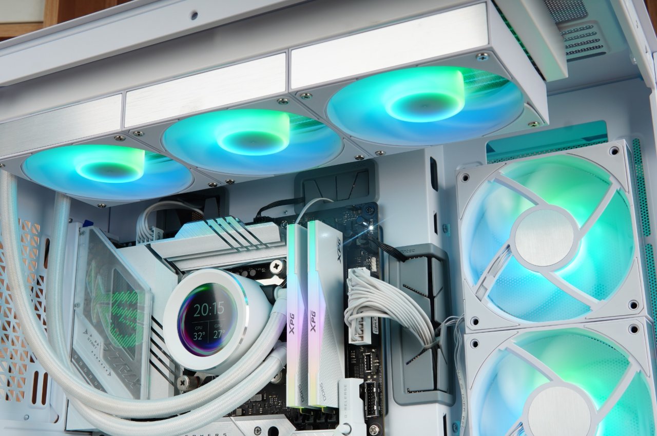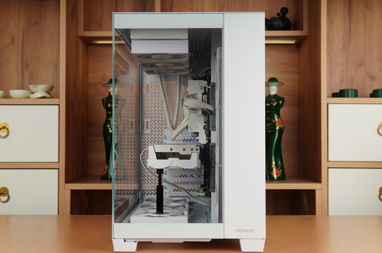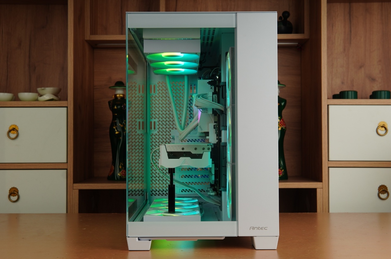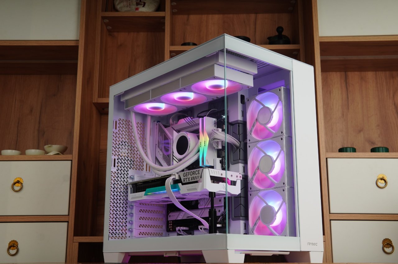 最后的装机效果我个人还是相当满意的,白色版的安钛克星际C8搭配同为白色的PC组件很容易就能形成一台高颜值的主机,并且主仓可以同时透露出多把RGB风扇的灯效,光污染几乎是拉满了。下面就来看看这套配置的散热效果到底如何。