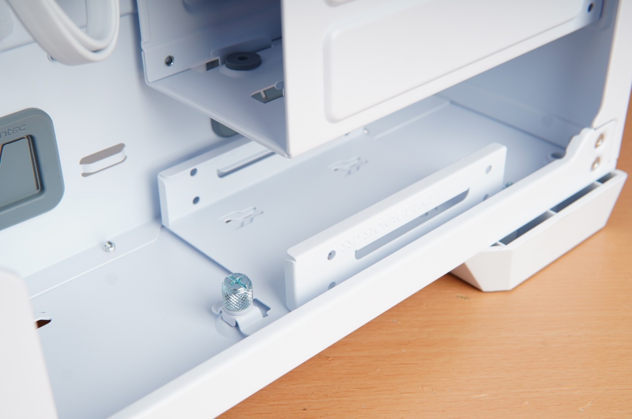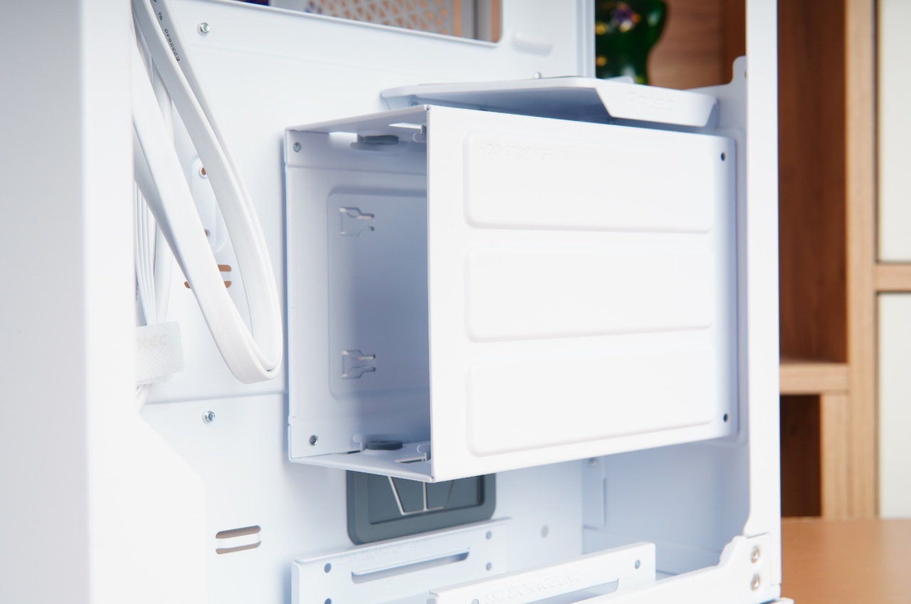 在电源仓下部则配有一个3.5寸的HDD硬盘仓以及在机箱底部处配有一个2.5寸SSD的硬盘安装支架,两者均可最大同时安装2块硬盘,因此在存储扩展性方面安钛克星际C8同样有保障。机箱到这里基本就介绍完毕了,下面就来看看实际装机效果如何。