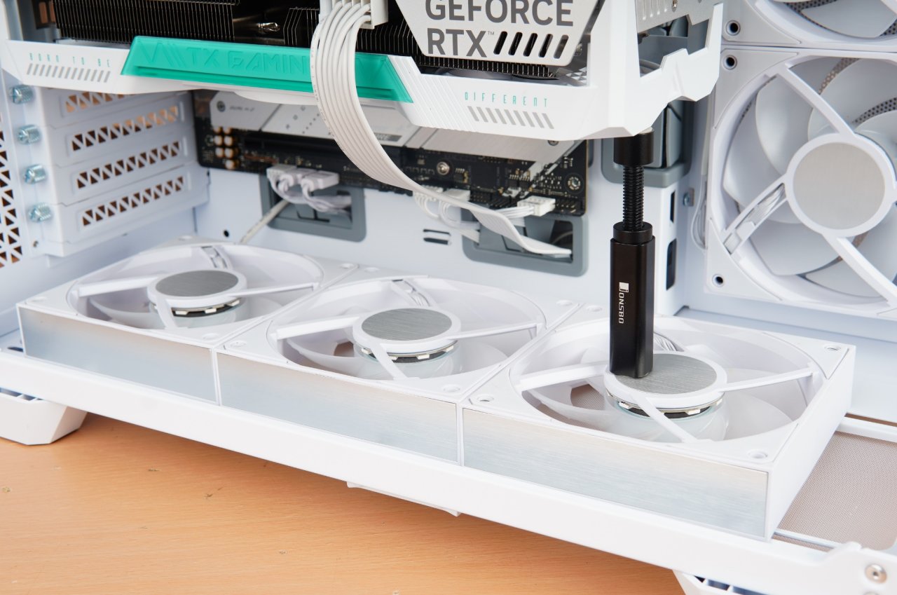 机箱底部的风扇支架出厂默认为140mm宽度,玩家们可以在附件包中找到另外一块风扇支架,在更换后即可支持120mm风扇的安装,亦可以安装360mm规格的冷排。