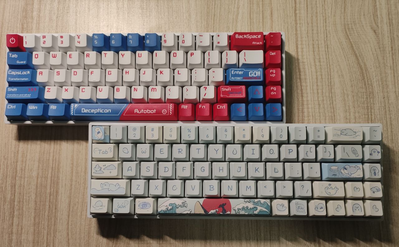这把键盘本身的键帽就挺不错的,PBT键帽耐用又好看,我买的另一家龙乘小海豹虽然很可爱,但是能看出来键帽本身有明显的阉割。键帽的高度不够,露轴现象严重。且HW68的空格为6.25u,小海豹的空格并不适配,所以要自己去购买一些颜色元素相近的空格键帽。