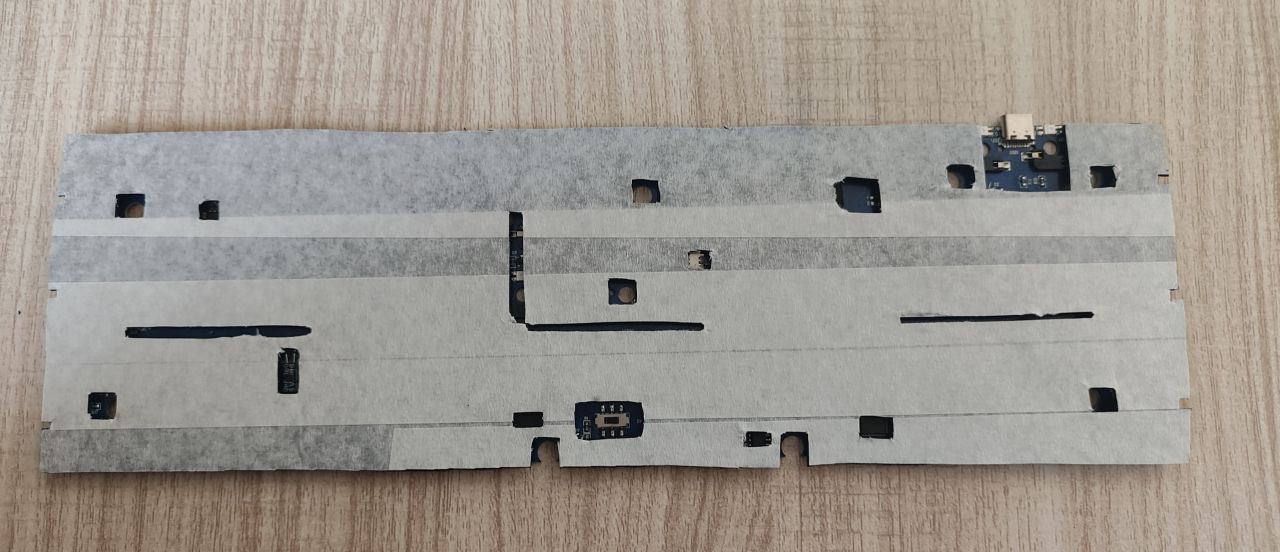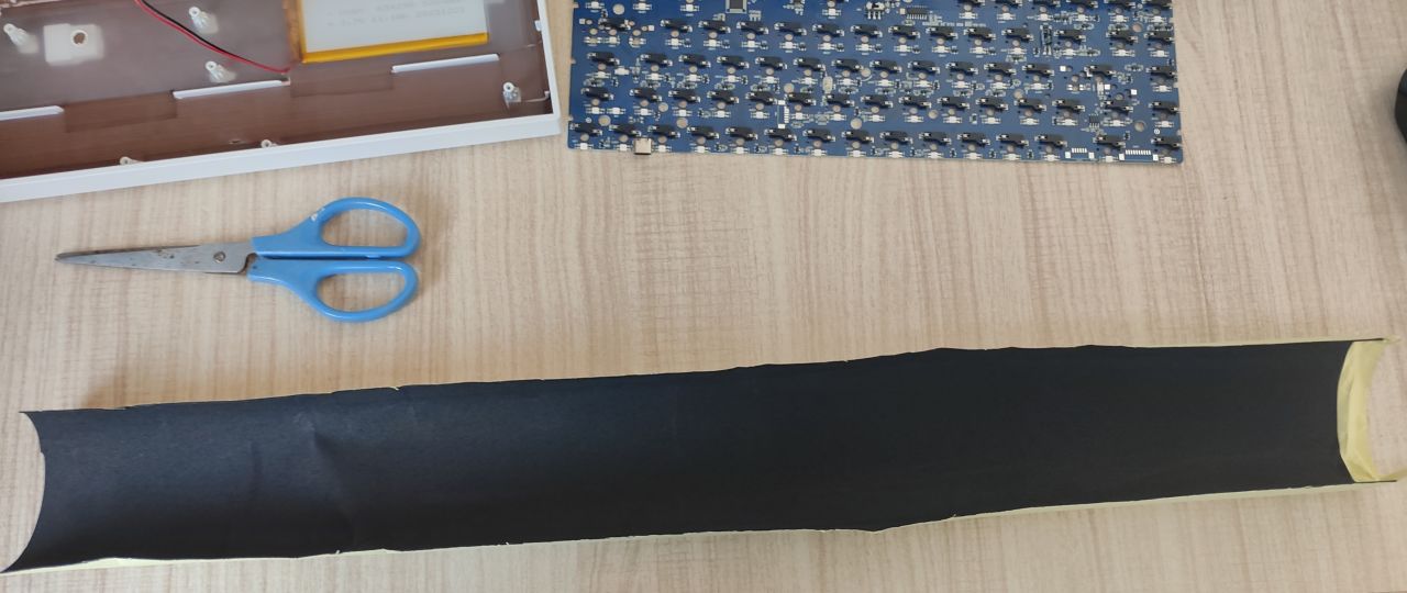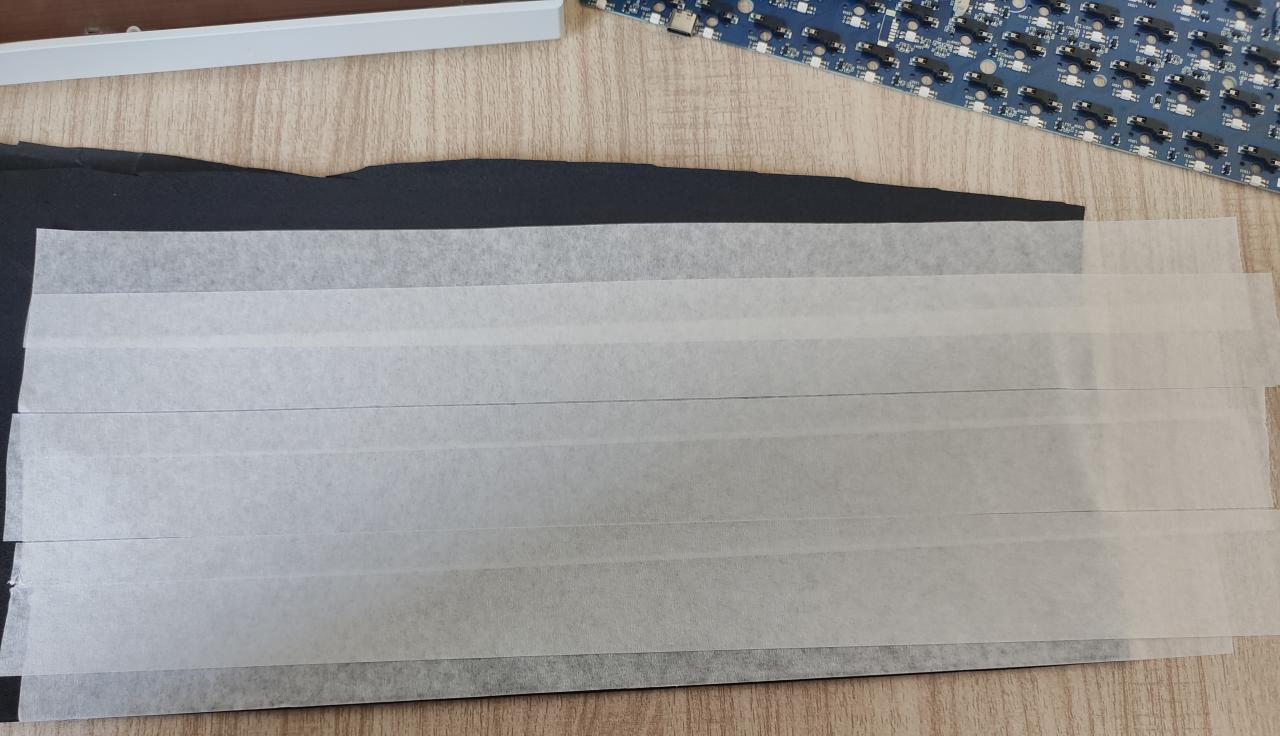 楼主不小心把eva棉买错了,应该买发泡的eva棉,然后裁剪出至少pcb板两倍大的eva棉,双面对折粘贴后,在其中一面贴上美纹纸,裁好后再对着pcb板细致修剪边缘后将美纹纸一面对着底壳,eva棉一面对着pcb板,依照pcb板和限位柱,剪出限位柱、电线接口、电阻和芯片的孔。有很多客制化佬喜欢用美纹纸和pe胶带做一个封包。这样确实对键盘声音有很好的效果,但是楼主比较担心第一是在潮湿的地区美纹纸可能使电路板短路,第二是很多人反映pe胶带用久了黏性降低,在敲键盘时可以明显听到胶带粘粘的声音。所以并没有采用这样一种方式。