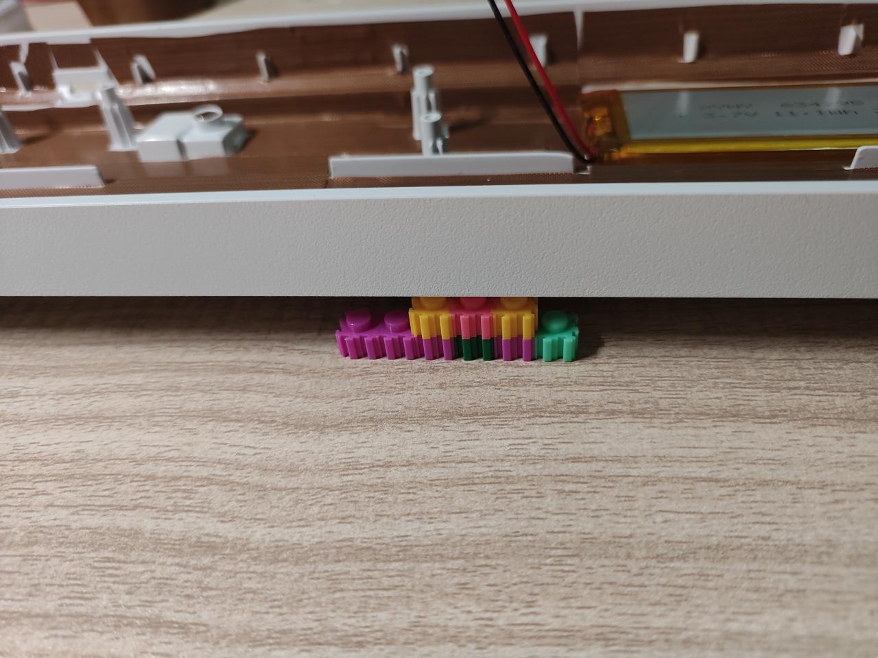 买一些10度的AB硅胶并准备一个干净的杯子、搅拌棒和一副手套。将AB胶按1:1的比例混合好后,均匀倒入底壳中。因为硅胶的流动性很差,所以尽量在倒的时候就均匀一些倒,不要在倒完后左右大幅晃动。一般150g左右就够用了,因为这把键盘在设计时并没有考虑到后续填充,所以pcb板与底部空间有限,硅胶底垫只需要薄薄一层就够了。倒完后找一个支撑物(楼主用的小积木)使键盘中的硅胶保持水平静置一晚,太冷的地方可以放久一些。第二套轻摸表面没有黏性说明已经定型。如果硅胶底垫太厚这时特氟龙胶带的一个用处就出现了,你可以很轻松的将硅胶底垫扒下来再重新制作底垫。特氟龙胶带不叠层也是因为防止胶带黏性不足硅胶渗入胶带下方导致硅胶凝固后和胶带缠在一起。最后将定型好的底垫和胶带处开孔方便开关等元件通过。
