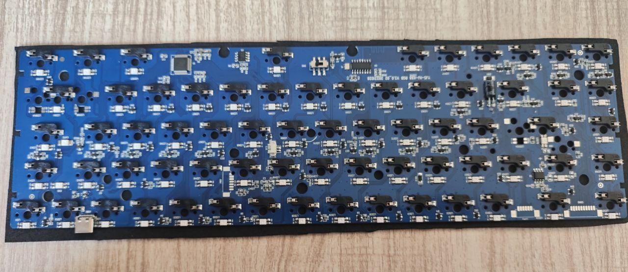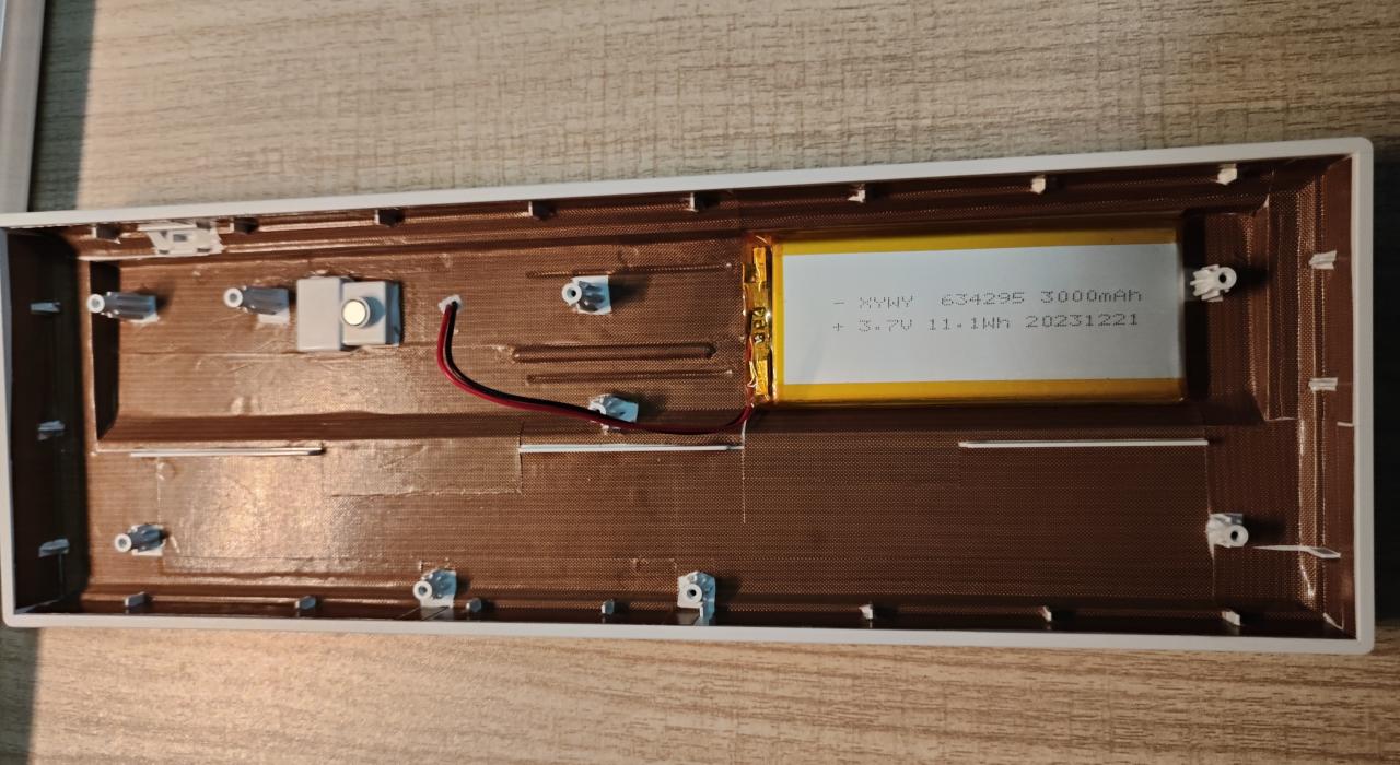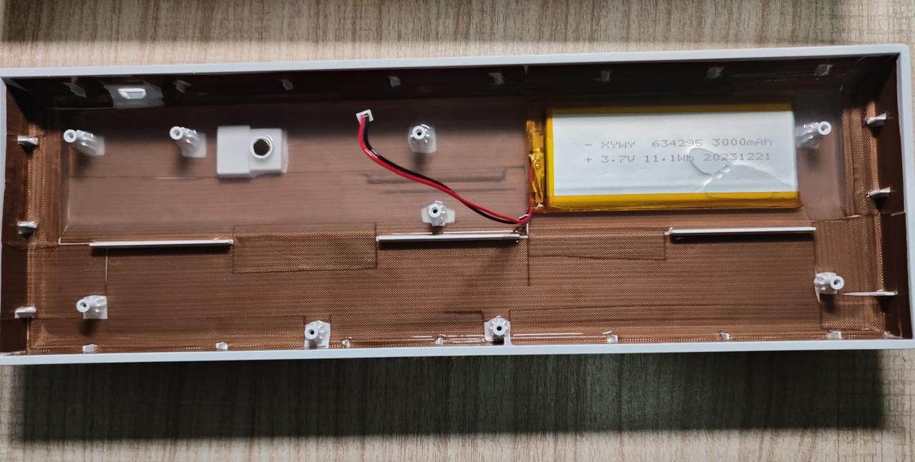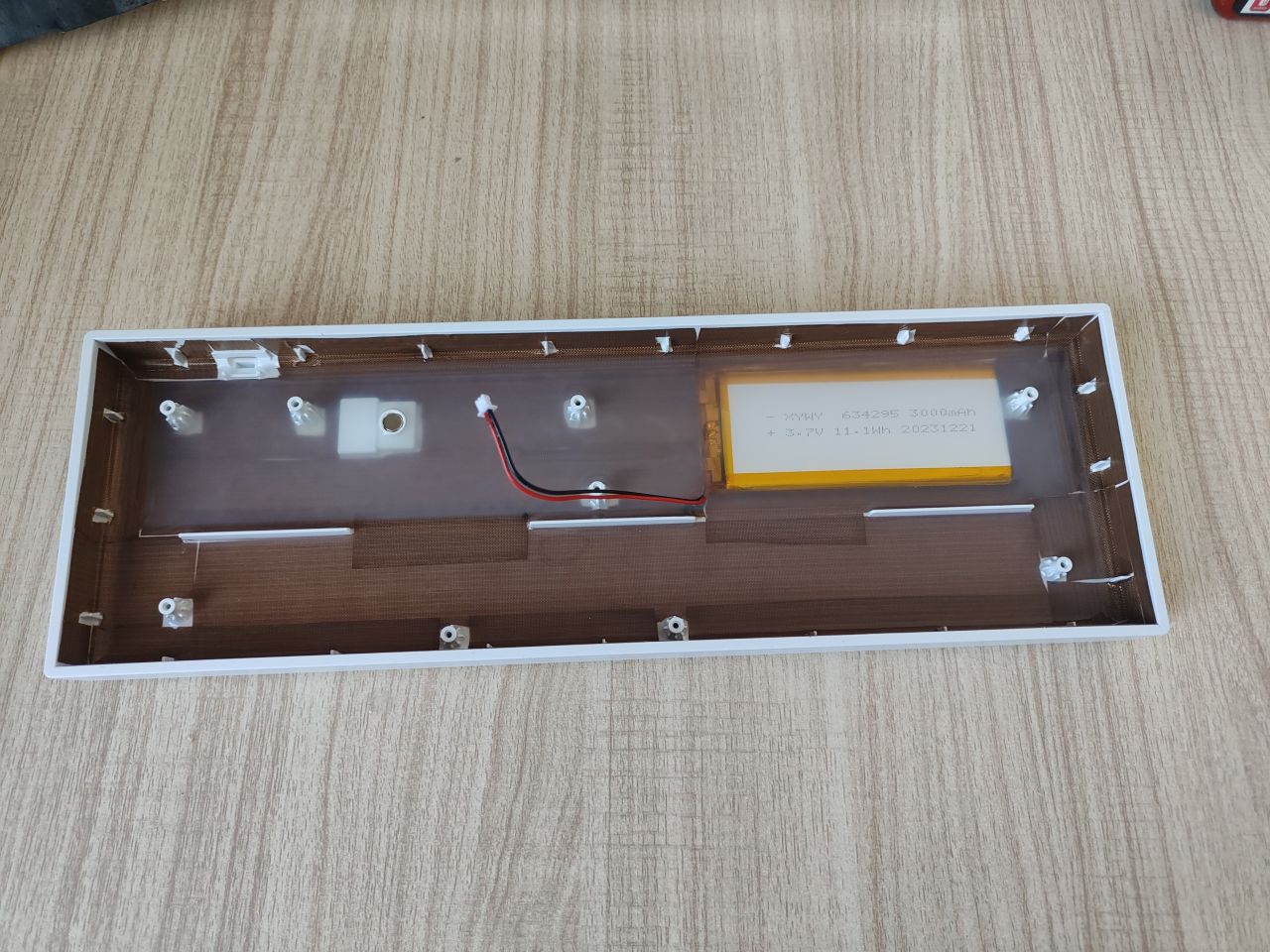 将键盘拆开后,可以看到这把68配列键盘包含一张eva泡棉,pcb板,po棉,pc定位板,一块3000mAh电池,PBT键帽,68颗红轴。底壳外表面是磨砂质感,采用船壳结构。所以键盘的声音非常糟糕,这也是本期爆改的原因。
