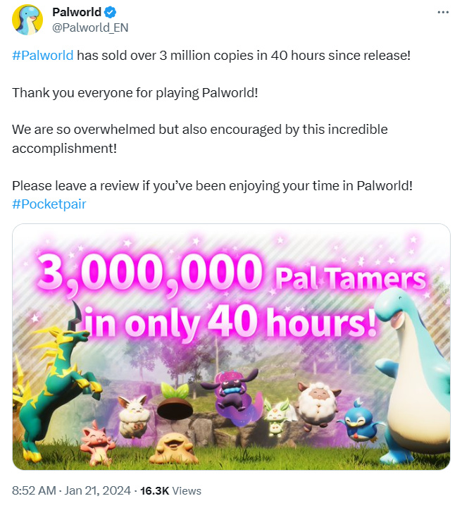 《幻獸帕魯》的官方宣佈,在遊戲發售的短短40小時內,銷量已經突破了300萬份!官方對廣大玩家的支持深表感激,並對這一驚人的成就表示震驚,同時也爲此感到倍感鼓舞。