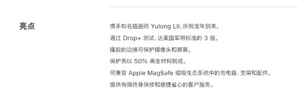 官方表示,为庆祝龙年到来,这款手机壳由知名插画师Yulong Lli精心绘制,用绚烂的牡丹烟火图案、卷曲流动的线条和明亮的色彩,生动展现龙的勇猛精神,寓意喜庆吉祥。