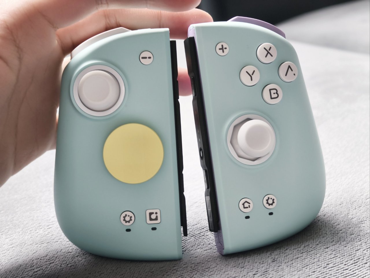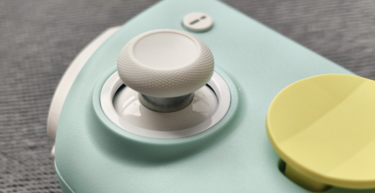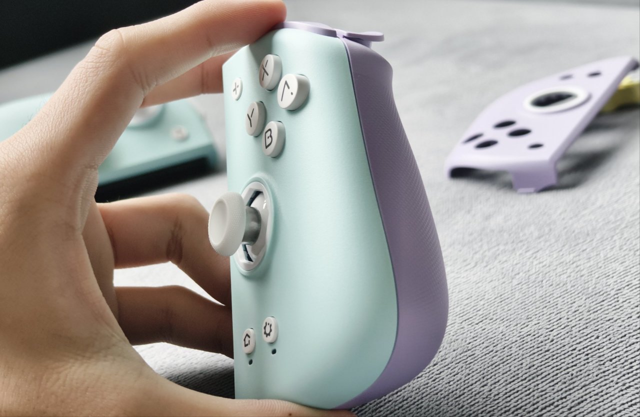 下面我应该是聊聊十字键的,但是在聊他之前先聊聊他的面壳吧,配件方面不是还额外赠送了一青一紫两个面壳吗,你就可以给他替换上,他是磁吸的,很容易进行一个拆卸和组装。当然你要是喜欢还可以自己进行一个改色与DIY。下图就是成品的一个效果,从正面上来看是青色的,算是给不喜欢紫色或青色的人群多了一个选择。