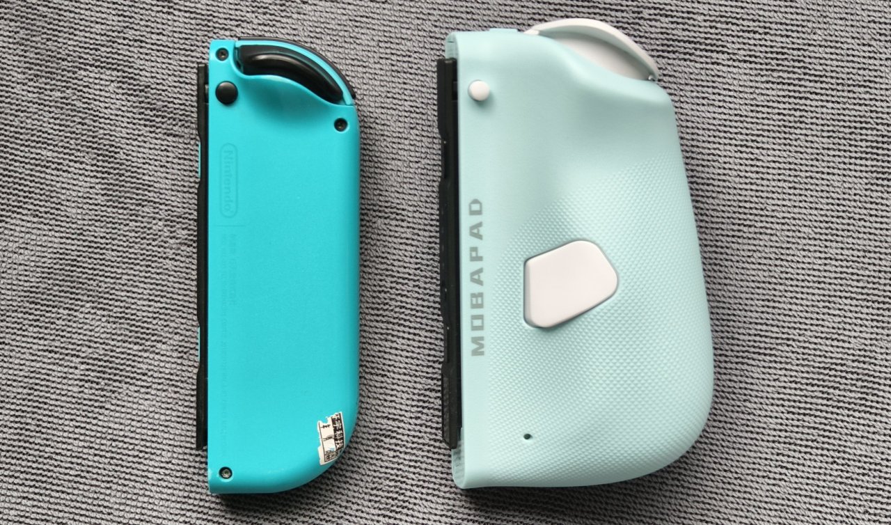 大小方面我拿出了正版的JOYCON进行了一个对比,你可以很明显看出它的大小方面豪不夸张的可以说是大了两倍,模具方面也有所不同,采用了人体工学设计,可以让手柄的各处受力点与你的手掌所吻合,因此虽然重量方面他是170g(JOYCON为100g),比原配足足重力70g,但是整体握持下来是感受不到增加了多少的。