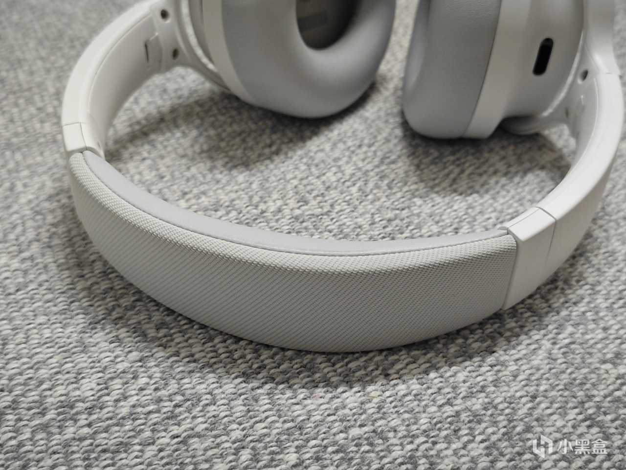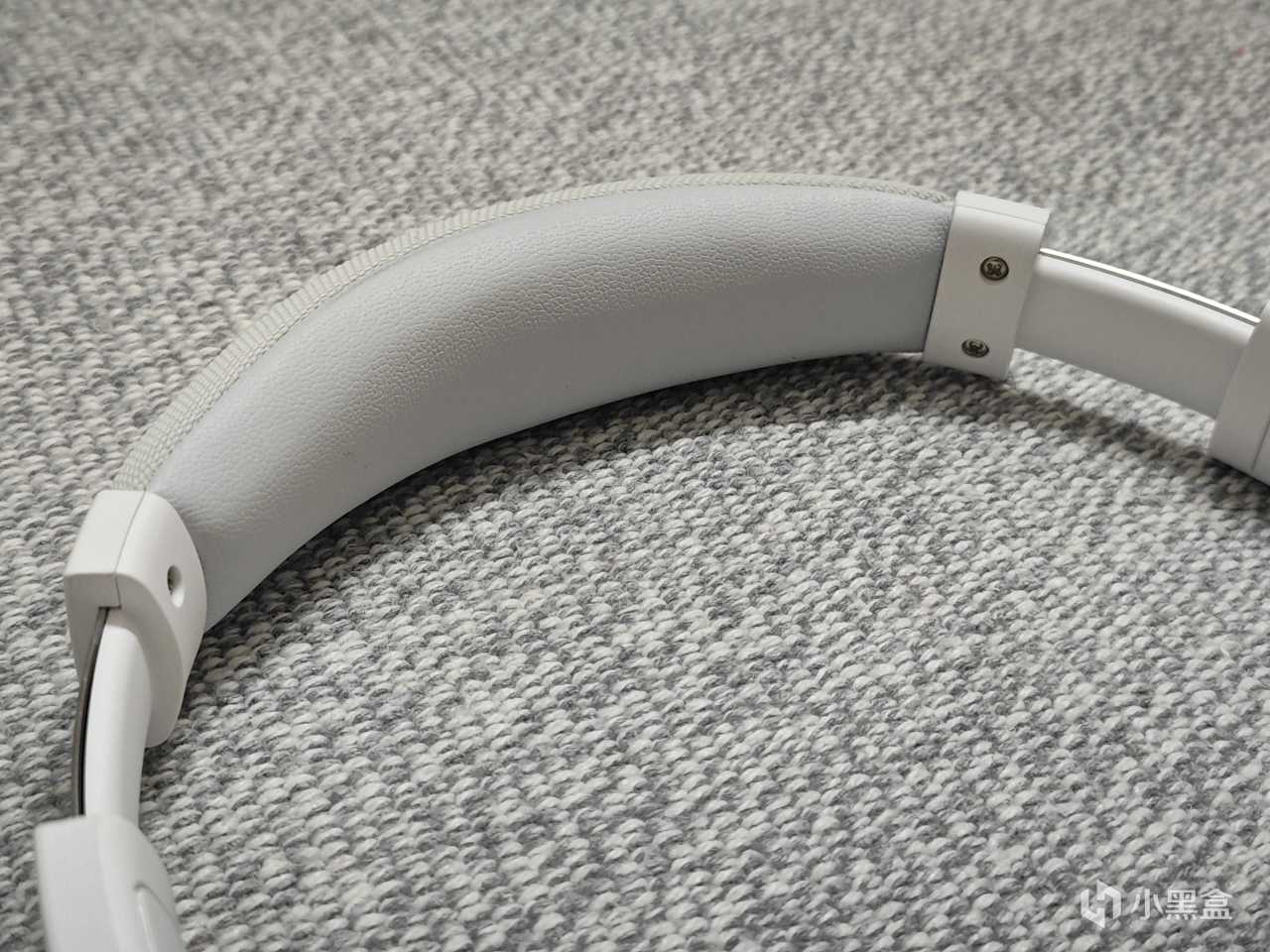 耳机的头梁部分,贴合头部的地方材质是仿蛋白皮质,内部有海绵填充。顶部为网布。拼接的设计非常好看高端。支臂为可伸缩设计,增强了佩戴的舒适感,久戴也不压头。