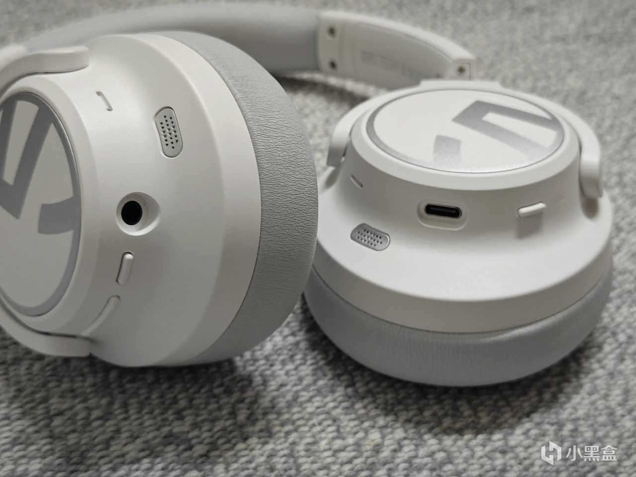 耳机的左耳罩部分配备3.5MM接口、开关按键、音量按键。耳机右侧是ANC键和充电口,按键做的比较小巧,一体感很强。