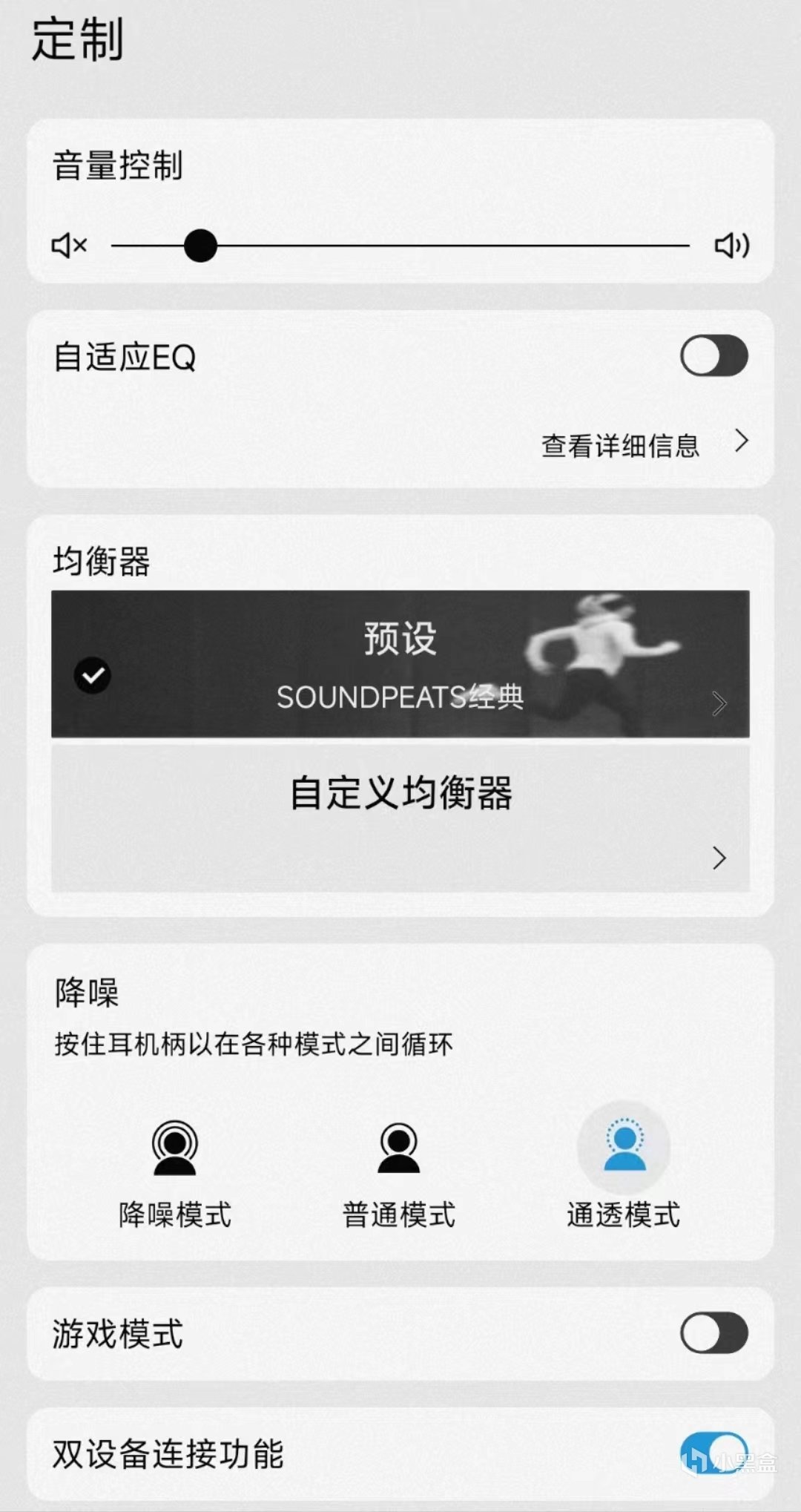 泥炭泥炭Space还能通过官方的APP对耳机进行个性化设置。APP的功能也是非常全面,除了可以切换模式,自定义均衡器,或对固件进行升级外,还能在预设的EQ中切换,或者开启自适应EQ,让你的耳机更加了解你的耳朵已获得更好的音乐体验。