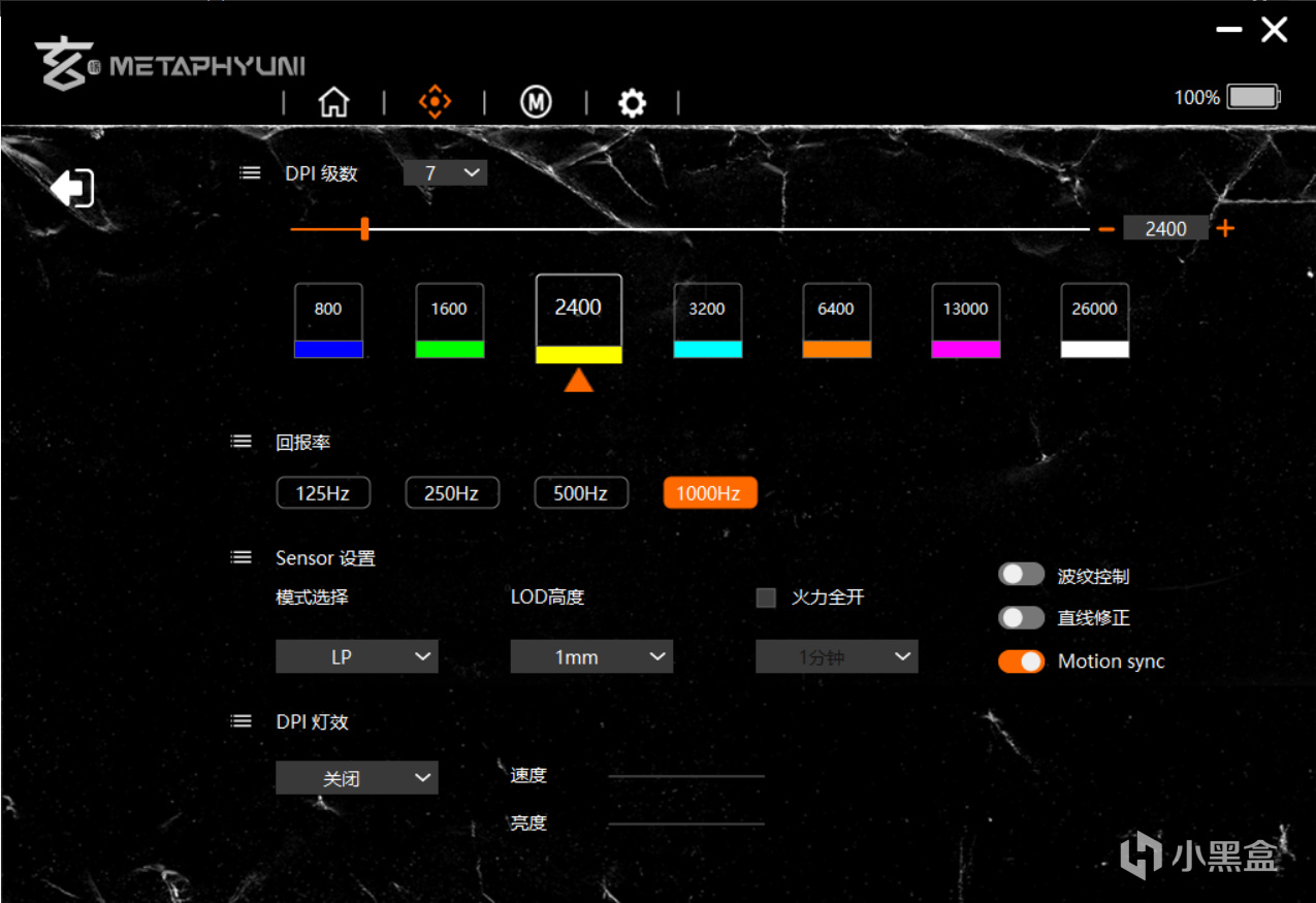 玄派这款鼠标采用的是原相3395传感器,也算是现在游戏鼠标的标配了,主要还是过一遍参数好吧,最高26000DPI,650IPS,50G重力加速度, DPI后面也是预设了七个档位,预设的最高档位是26000,可以在驱动内自行调节,目前驱动方面档位数是可以从一个调到七个的,这个操作会导致DPI档位出现紊乱,并且按照之前的操作是调节不回来的,不过这方面倒是不用担心,自己拉一下DPI或者直接恢复默认就可以了,回报率方面最高1KHz,四档可调,在驱动中大家可以自由调节按键、DPI、回报率、LOD高度控制和波纹控制,也可以自由录入宏编程。