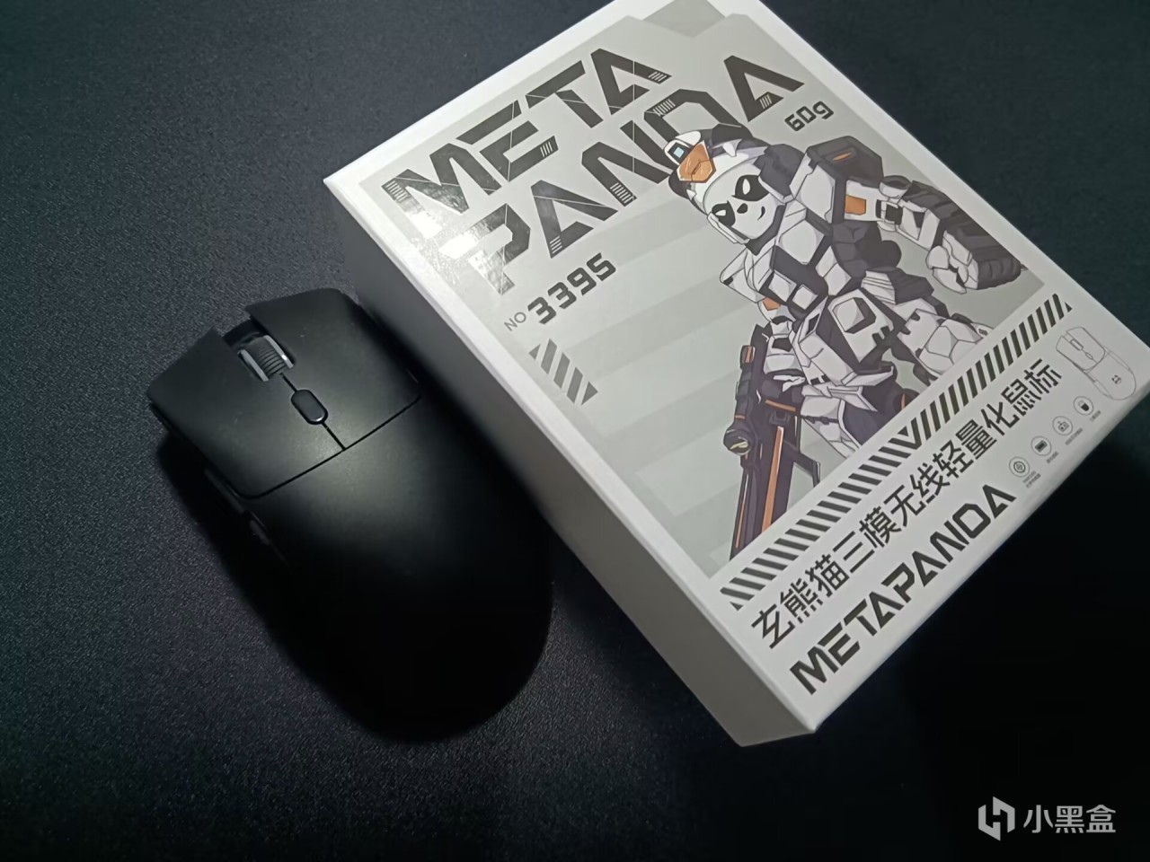首先就是外包装,除了正面,整体是比较暗的银灰色,正面最引人注意的是一个熊猫人,剩下的就是3395,60克和品名,右下角还有一个小小的简图,打开之后就可以看到鼠标本体和所有配件了。