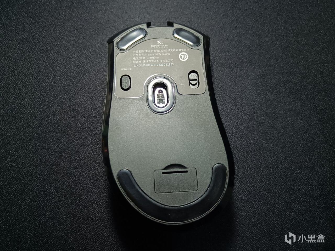 鼠标底部中间偏上的部分是传感器,左侧是一个蓝牙配对键,右侧是一个切换连接方式的开关, 脚贴采用的是PTFE材质,下边是接收器收纳仓,收纳仓盖是卡扣的形式,还是比较紧的,接收器放置的时候也是很稳的,不会出现那种盖子打开接收器就掉出来的情况。