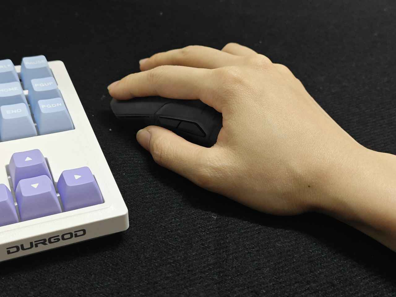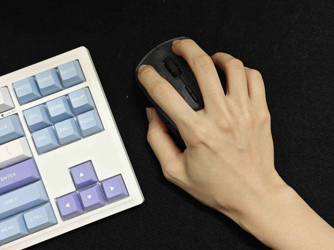 雷柏VT9Air是右手对称性的鼠标,比较适合中小手的抓握跟趴握,适合手指122或131握法。尺寸为120*65.7*37.5mm,模具与此前测试的VT9mini是一样的,拥有1+9个可编程的自定义按键。不带接收器的重量为59g,握持感非常棒。半透的磨砂细纹外壳,让我第一眼看到就为之倾倒,非常赛博朋克。