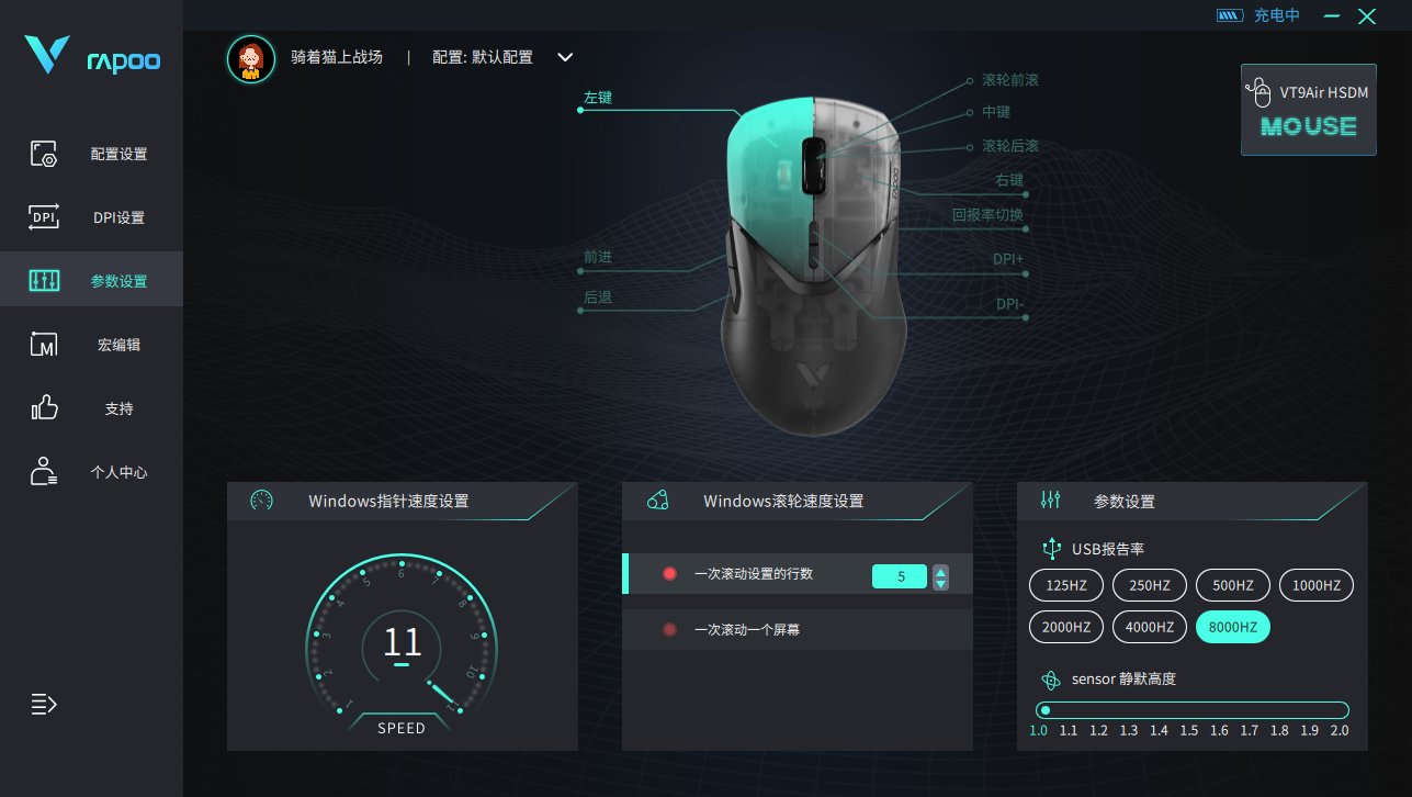 在雷柏的官方软件中,还能对鼠标进行深度的自定义设置,不仅能自定义指针速度,LOD静默高度,DPI速度。还能在125Hz-8000Hz(有线)中自由切换。雷柏VT9Air拥有1+9个可编程的自定义按键,可以对任意按键进行自定义设置,还能在软件中设置板载和云储存方案。当然,你如果是个喜欢折腾的人,那么还有按键宏这些高级功能在等你,VT9Air的可玩性还是非常高的。