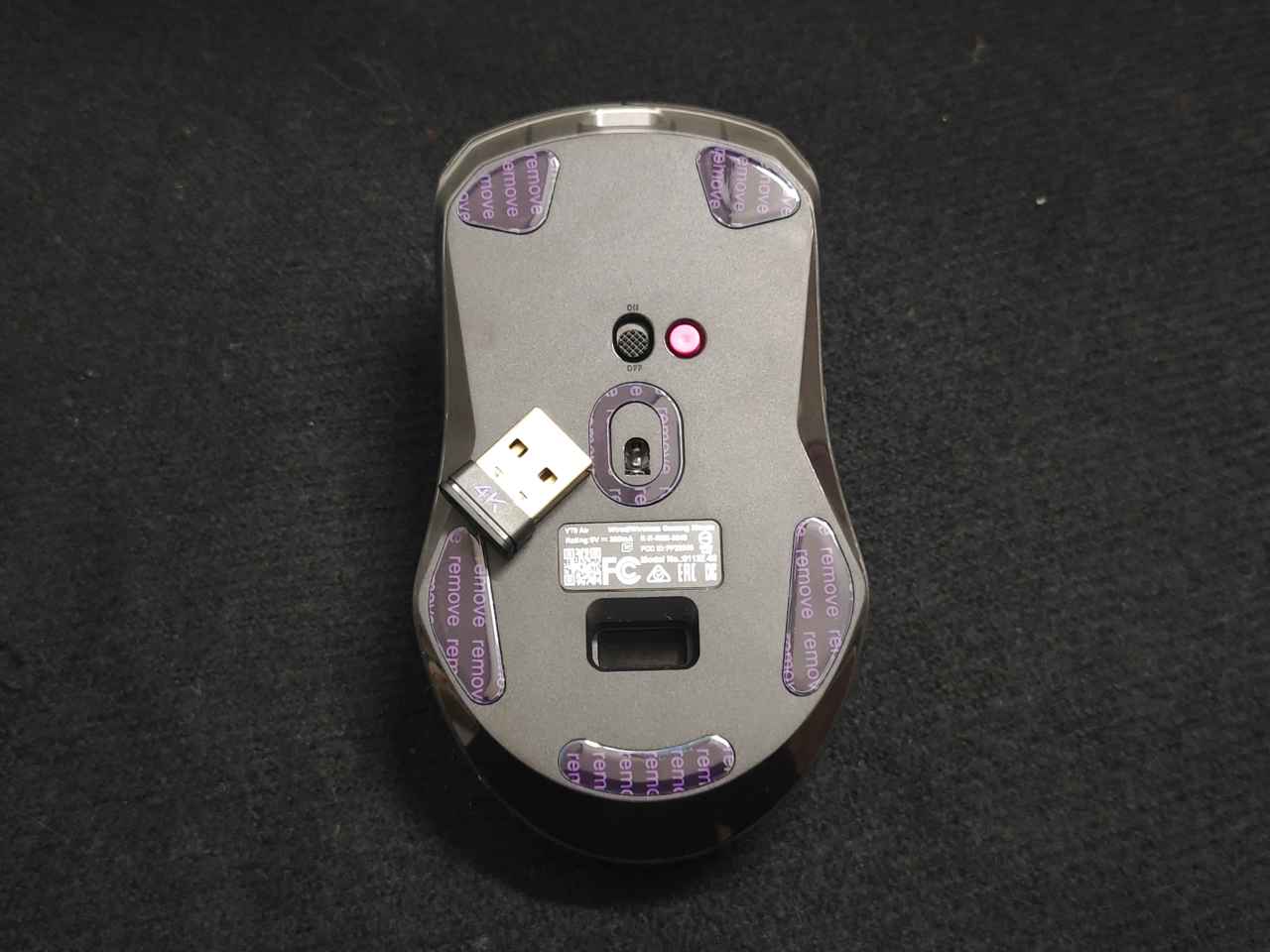 鼠标底部有一个开关键跟一个支持编辑的自定义按键。6块特氟龙脚垫,可以保证鼠标的移动顺滑流畅。接收器的收纳仓是磁吸设计的,可以防止接收器丢失。而且这次的接收器居然是支持4K的,这么小巧的4K接收器也着实让我震惊了一把!小巧归小巧,该有的功能也是一个不落下,他居然还有和V2M一样的实时电量RGB显示,再也不怕会忘记充电啦。