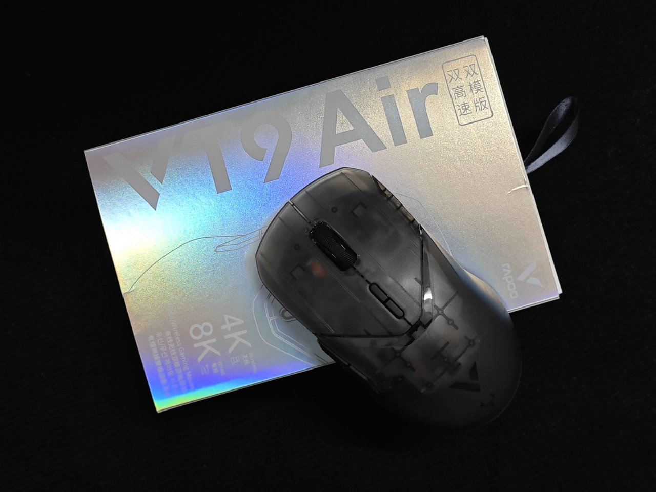 首先是惯例的开箱环节,雷柏VT9Air的外箱依旧采用经典的抽拉外箱+翻盖内箱组成,但与之前的VT9mini跟VT9pro不一样的是,雷柏VT9Air的外箱采用了镭射外箱设计,非常炫酷!VT9Air的全部配件包含: