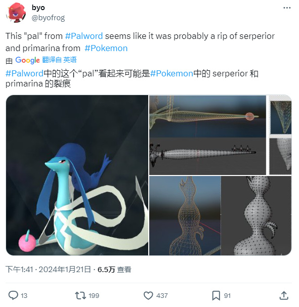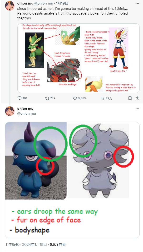 一個匿名 X 賬號聲稱這款遊戲不僅是借鑑了寶可夢的設計靈感,甚至還直接使用了《寶可夢朱/紫》實際遊戲材質,甚至還有網友找出了這款遊戲“明目張膽抄襲”的證據,但目前仍未出現任何一家遊戲公司公開指責《幻獸帕魯》抄襲。