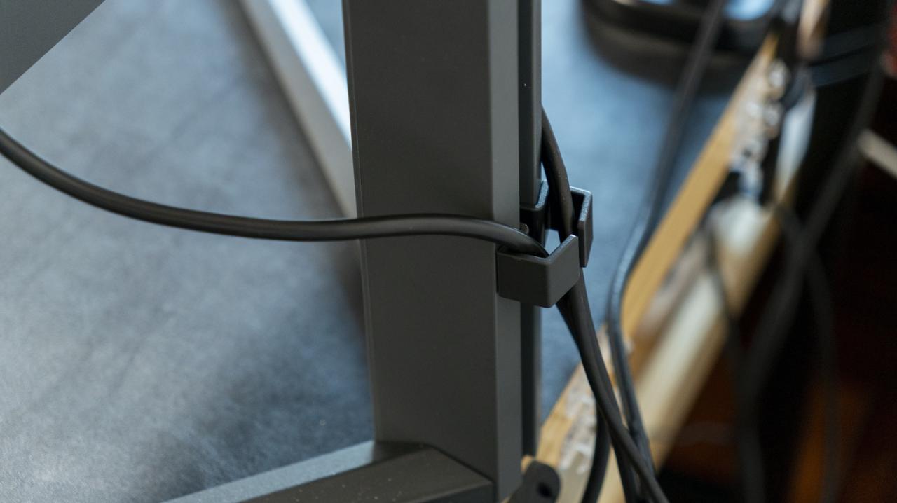 显示器支架支持130mm的升降,-5-20度的俯仰和30°的左右旋转调节。由于尺寸原因不支持垂直旋转,调试阻尼性尚可。背部有理线孔设计,可以保持桌面整洁。