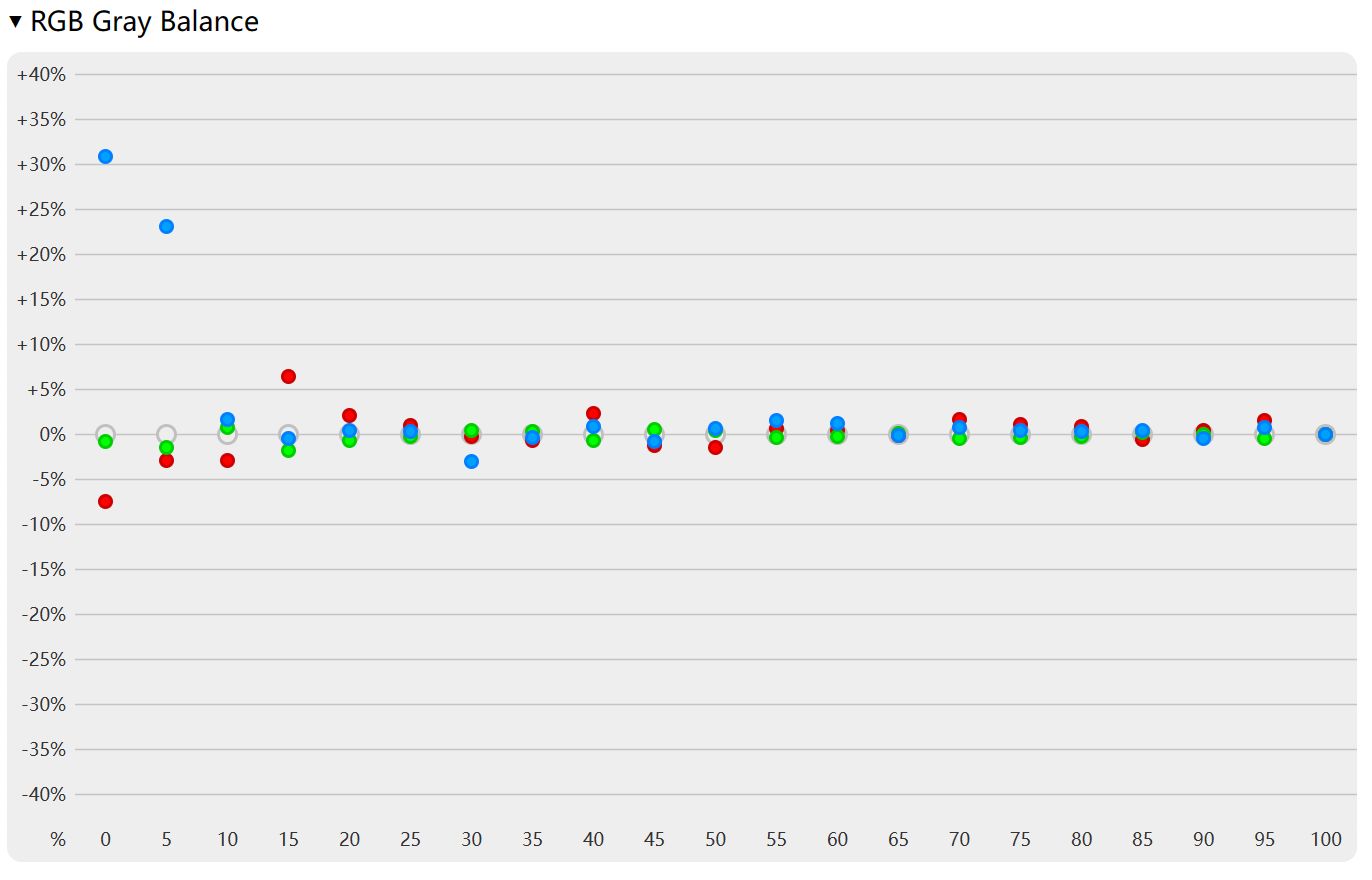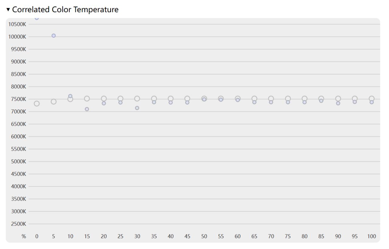 全亮度色温基本能维持在7500K上下,在30%以下低亮度开始发生较大偏移,在10%以下亮度发生严重偏移。RGB全亮度灰平衡也和色温测试情况相同,都是在30%亮度下发生严重的便宜。