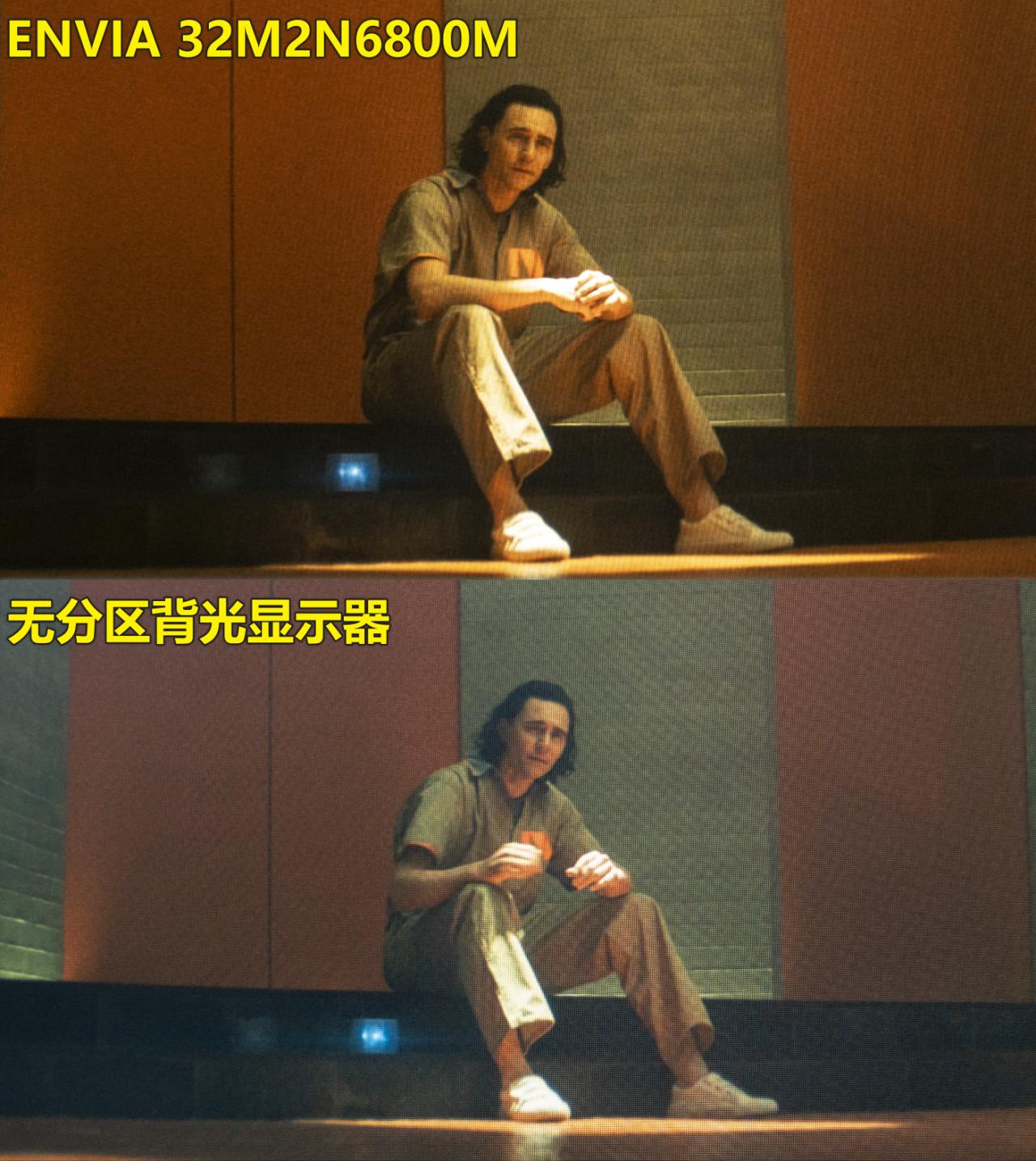 相比之下,采用分区背光设计的屏幕能够更好地控制各个区域的亮度。抖森手部和鞋部的亮度明显高于其他区域,而暗处的台阶则保持其原有的暗度。这种精确控制亮度的能力不仅突出了主要焦点(抖森和宇宙魔方),还保留了暗处的细节,使整个画面更加生动且富有层次感。