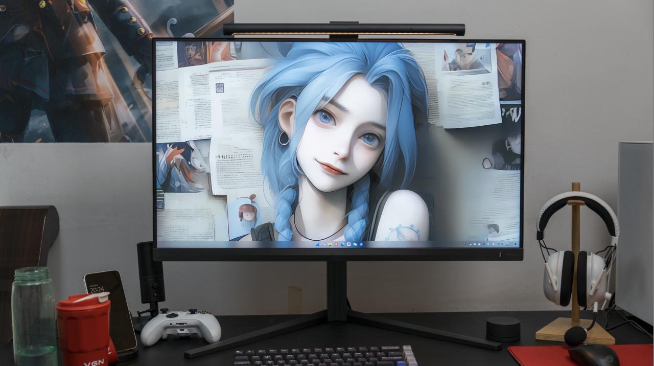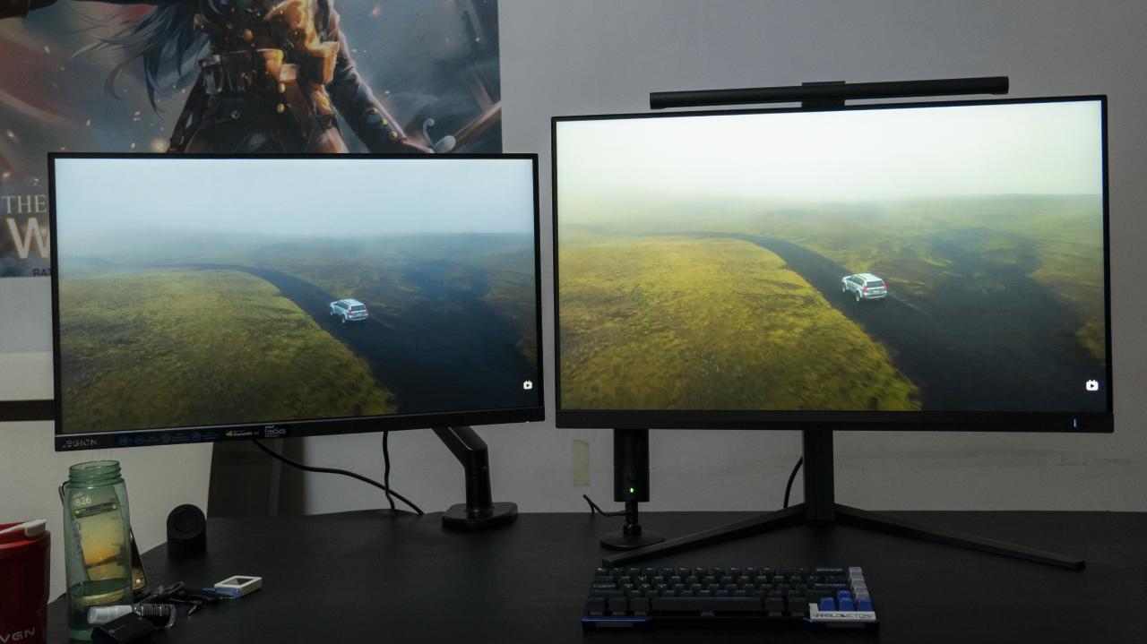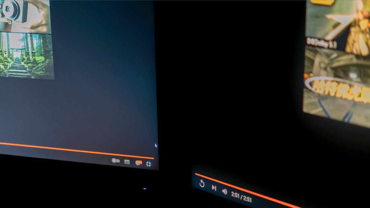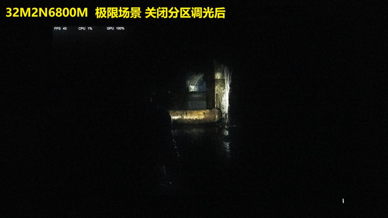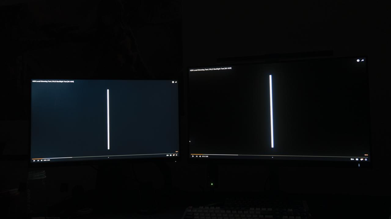 左边是没有分区控光功能的屏幕,右边是1152分区的32M2N6800M。桌面空间有限,实在是再放不下一块OLED屏幕来对比了。从我用过这么多块屏幕的体验来说,1152分区在这种极限弱光下还是会有光晕,显示效果对比OLED屏幕逊色一些,但和普通屏幕对比那绝对是遥遥领先。