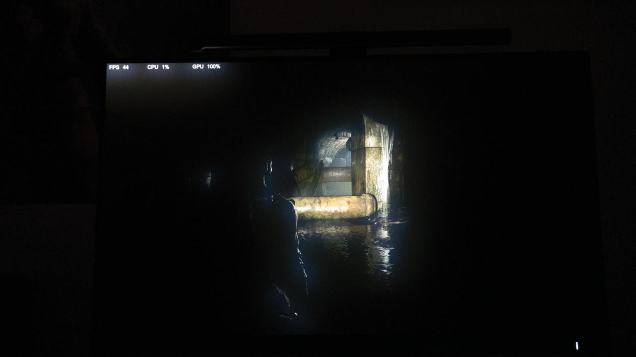 以游戏《美末1》为例,当在下水道这关只能依赖手电筒进行照明。尽管画面在明暗细节和层次感上有所体现,但在这种全黑的环境中,MINILED的光晕问题会格外明显,屏幕上的小块亮光给纯黑背景留下了瑕疵。这种一块块的小光晕,实在让人感到不适。