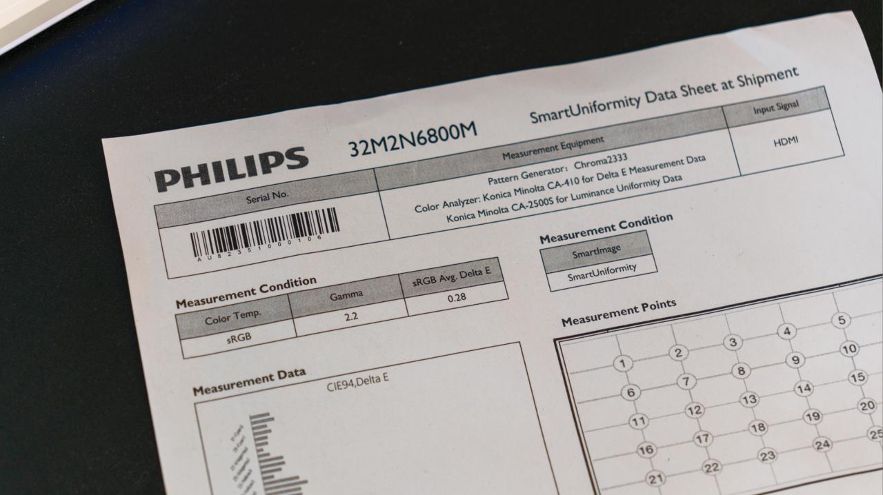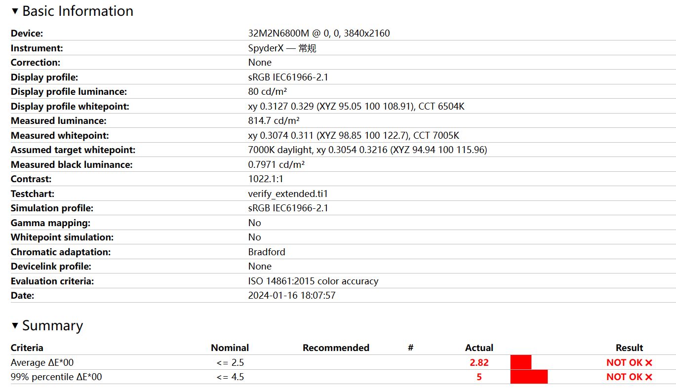 32M2N6800M在出厂时已经经过校色,在包装箱内附有一份校色报告。这份报告表明在HDMI连接下使用CA410测试,SRGB平均色准为0.28。