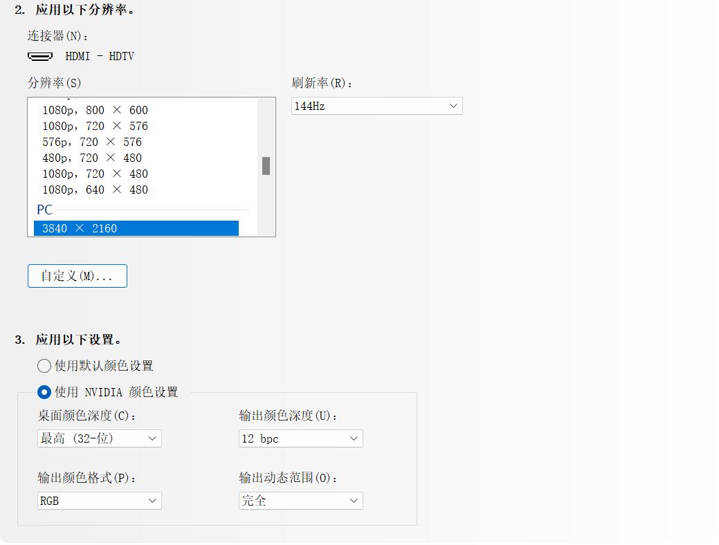 - 使用HDMI连接时,接口速率为HDMI 2.1,最高可以支持到3840*2160、144Hz、12Bit、RGB444的全范围输出。