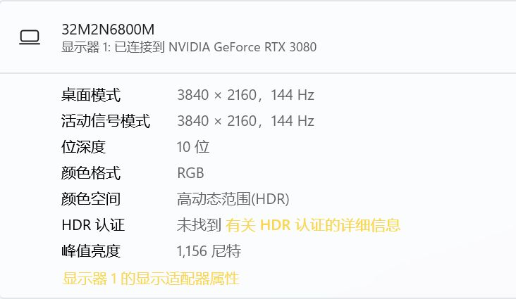 由于这次是分区控光显示器,所以优先测试HDR性能。在显示器详细信息可以看到驱动板内写入的峰值亮度为1156nit。