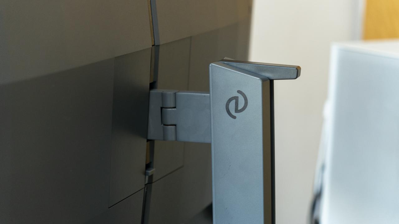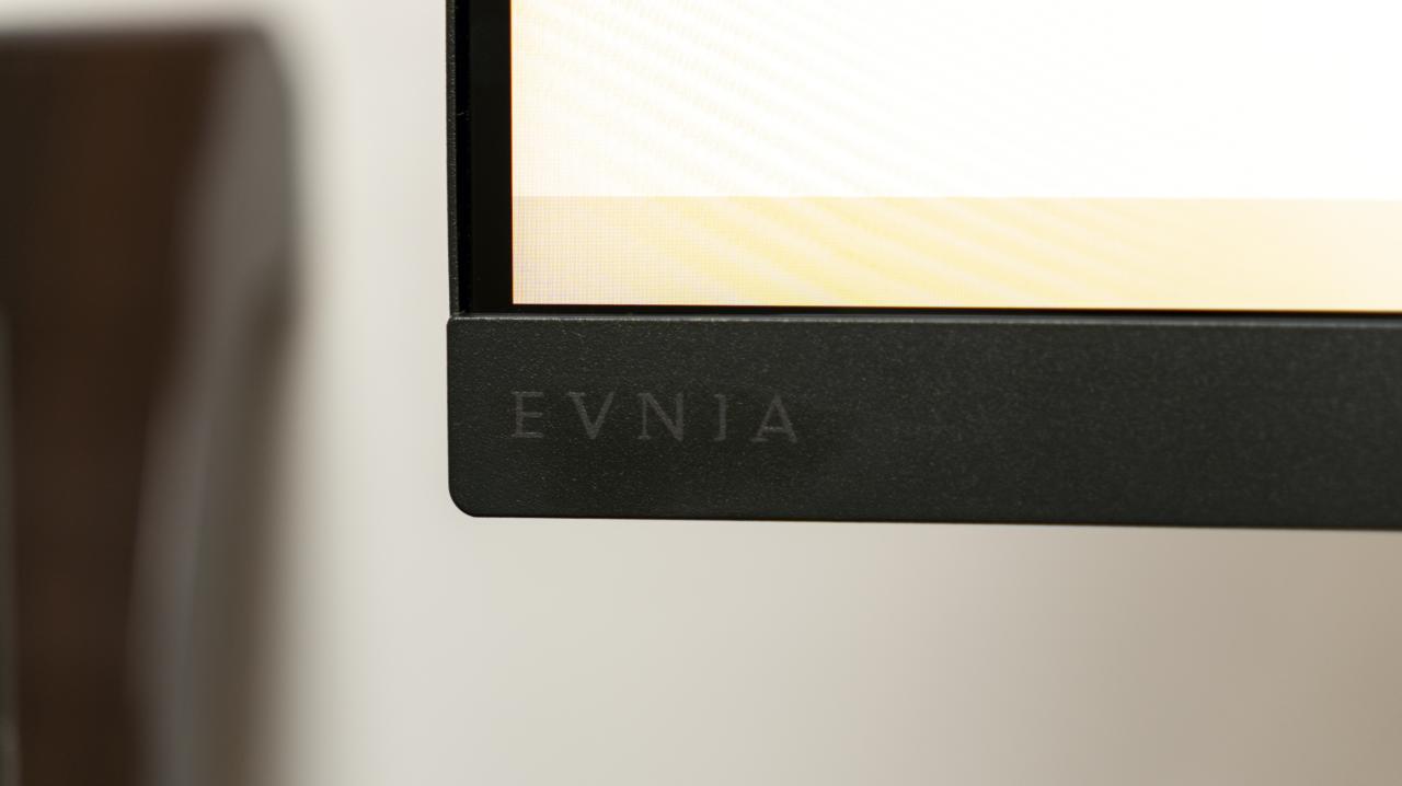 显示器正面依旧采用窄边框设计,提高了屏占比也进一步增强了视觉体验。EVNIA的logo很隐秘的融入到边框中,简洁而不失精致,在我看来,如果能将Logo做得更为醒目一些,在岩黑色的边框中加入一些点缀,或许能为整体效果增添一丝别样的魅力。