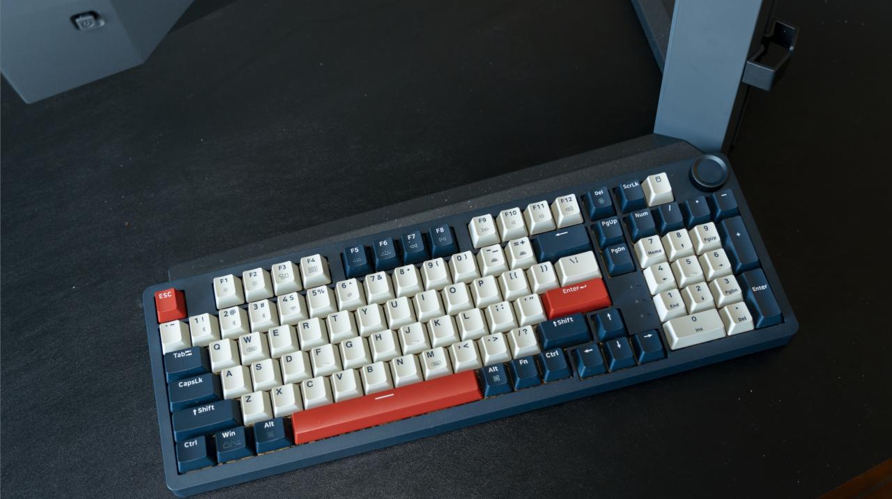 支架底座呈三角式设计,采用金属与塑料材质相结合,表面饰有点状大理石花纹,极具质感,支架背部还留有一个理线空间。但我必须再说一次,这个支架的尺寸非常的占空间,一把98%配列的键盘都可以完美的塞到下面,强烈建议搭配显示器支架使用。