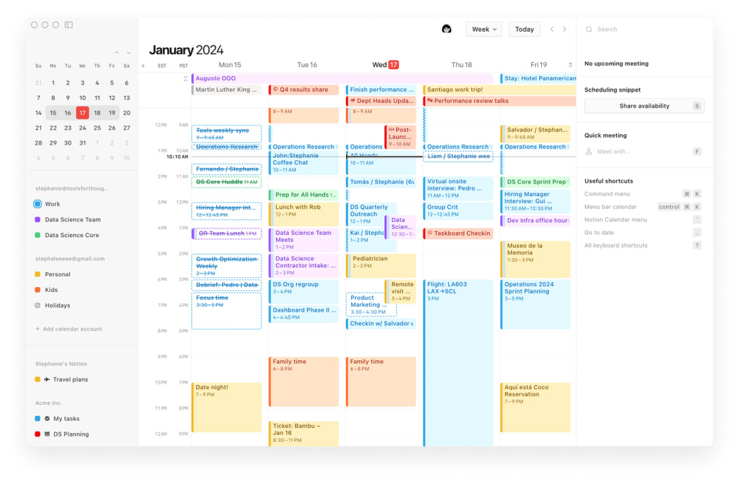 😉 不过现在有了Notion Calendar,你无需了解更多数据库搭建功能,也不需要专门去搞一堆自动化把Notion的安排信息同步到其他日历中,一个Notion Calendar即可一览所有Notion里的相关安排:
