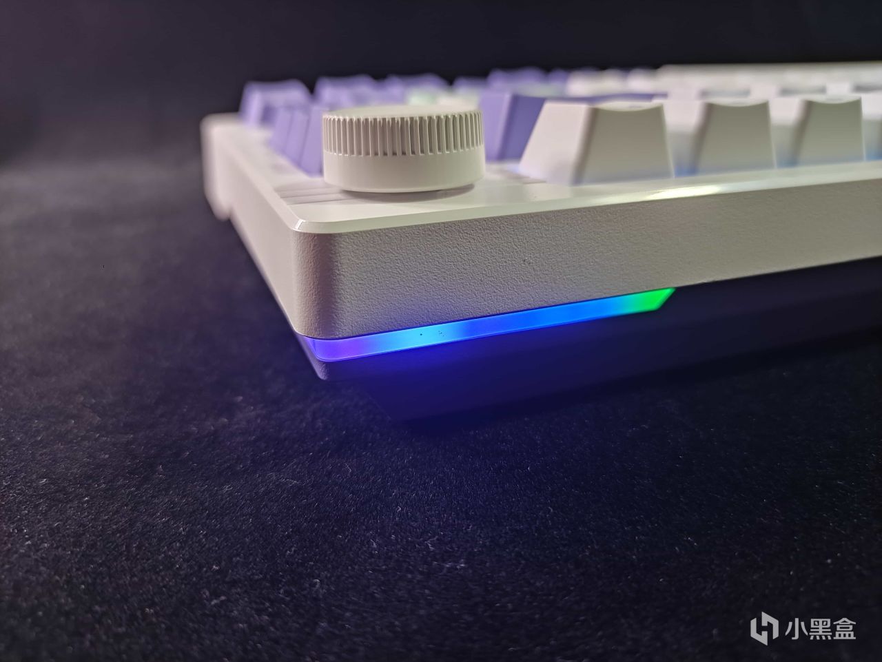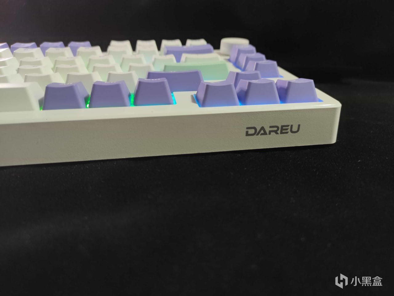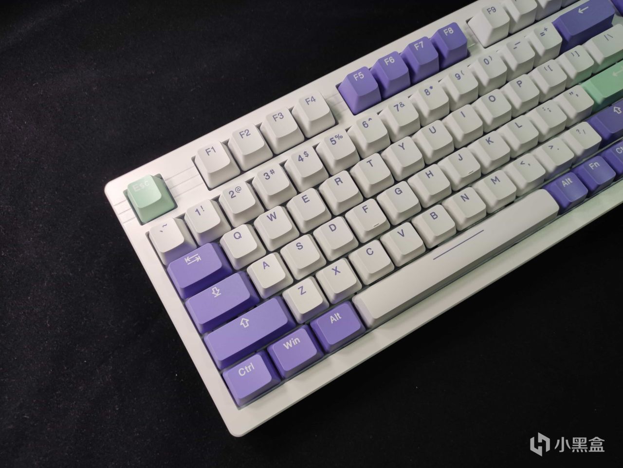 键盘第一眼看见的感觉就是清新,键盘少部分键帽用了紫色的配色,一些用的是青色或者肉色(色彩白痴),配合上主旋律的白色,整体的视觉效果确实不错。